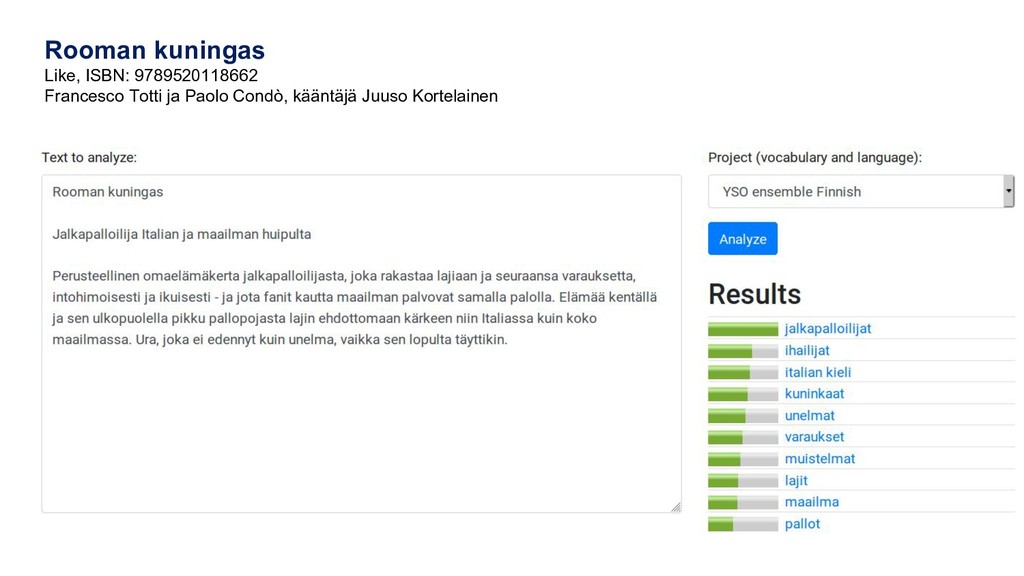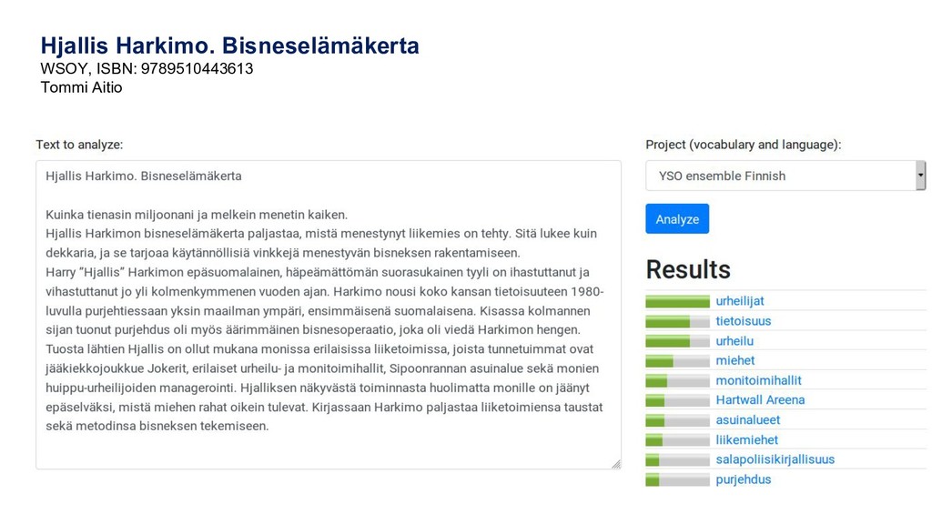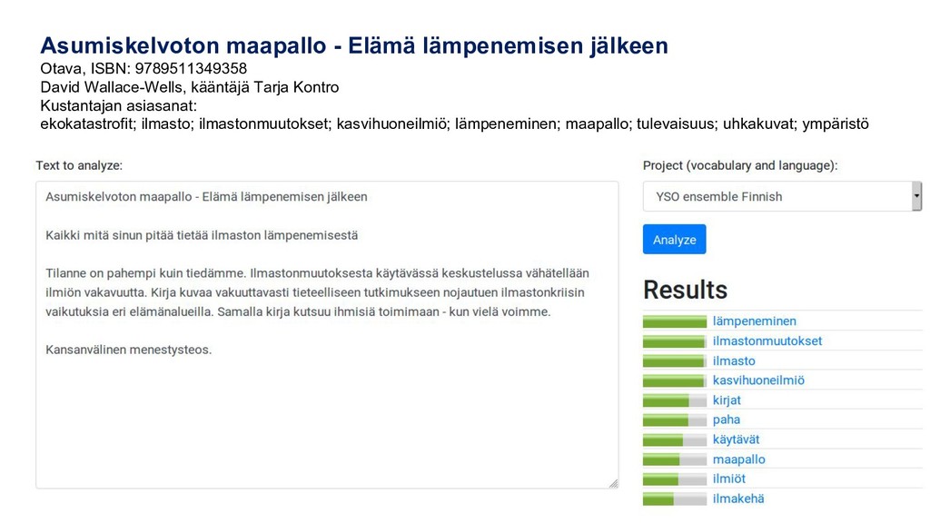 Annif: automaattinen asiasanoitus ja luokitus kirjan tuotetietojen ja sisällön perusteella