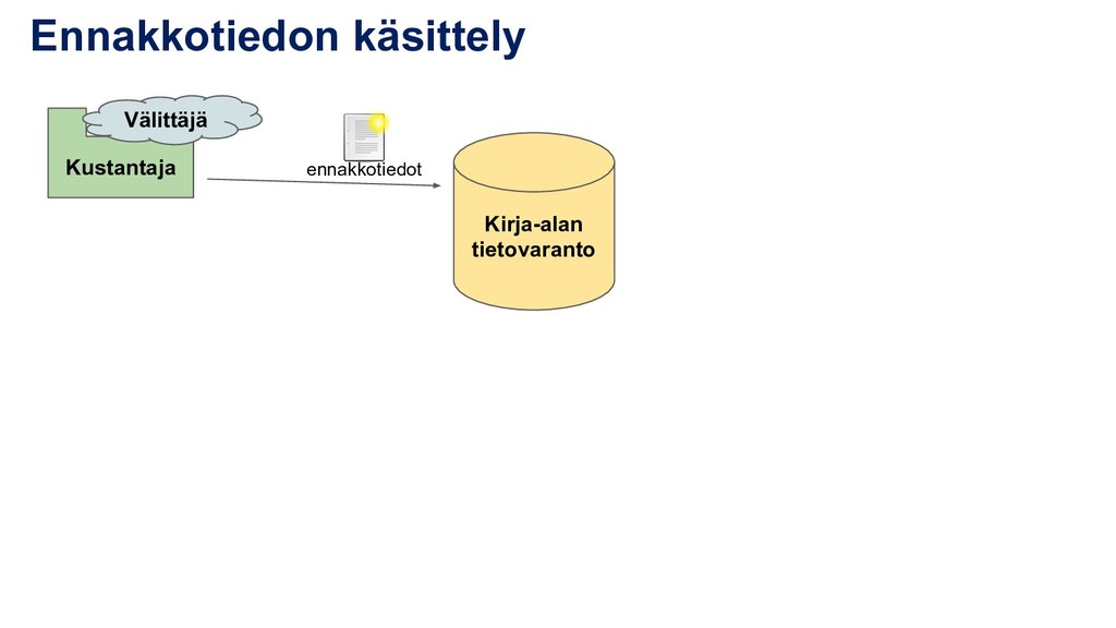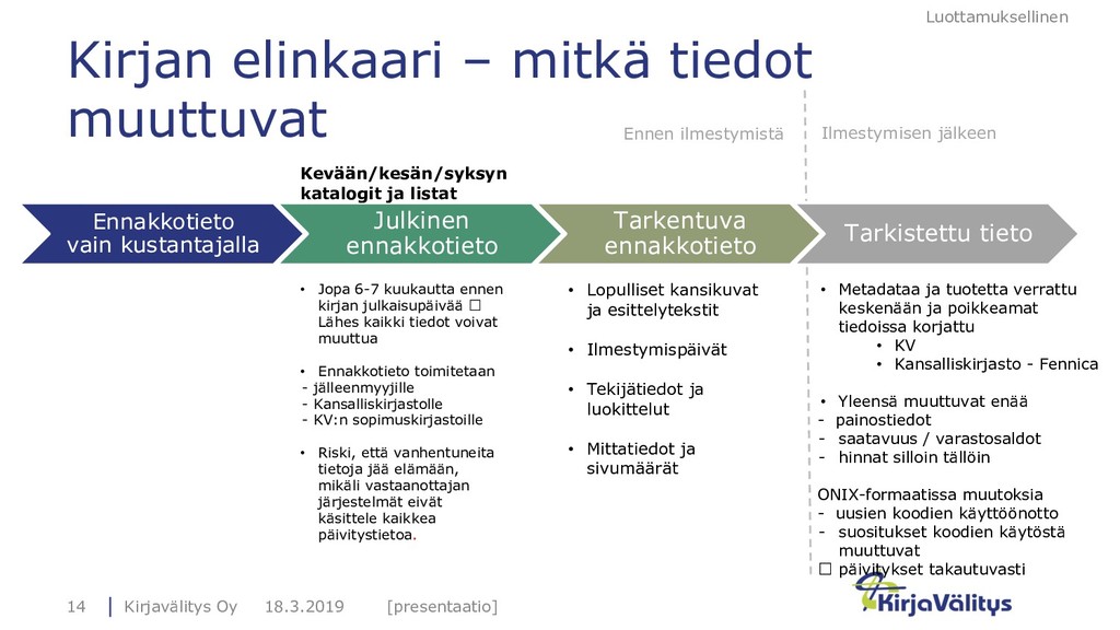 Ennakkotieto vain kustantajalla Julkinen ennakkotieto Tarkentuva ennakkotieto ”Sisältötarkistettu” ennakkotieto Tarkistettu tieto Ennen ilmestymistä Ilmestymisen jälkeen • metadataa ja tuotetta verrattu keskenään ja poikkeamat tiedoissa korjattu • yleensä muuttuvat - hinnat - saatavuus / varastosaldot - painostiedot ONIX-formaatissa muutoksia - uusien koodien käyttöönotto - suositukset koodien käytöstä muuttuvat päivitykset takautuvasti • Jopa 6-7 kuukautta ennen kirjan julkaisupäivää Lähes kaikki tiedot voivat muuttua. • Ennakkotieto toimitetaan - jälleenmyyjille - Kansalliskirjastolle - KV:n sopimuskirjastoille • Riski, että vanhentuneita tietoja jää elämään, mikäli vastaanottajan järjestelmät eivät käsittele kaikkea päivitystietoa. • Lopulliset kansikuvat ja esittelytekstit • Ilmestymispäivät • Tekijätiedot ja luokittelut • Mittatiedot ja sivumäärät Kevään/kesän/syksyn katalogit ja listat ”Painovalmiin” aineiston perusteella - luokittelut - asiasanoitus automaation avulla