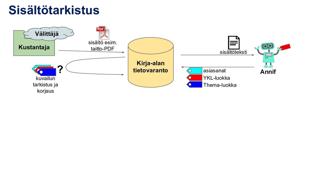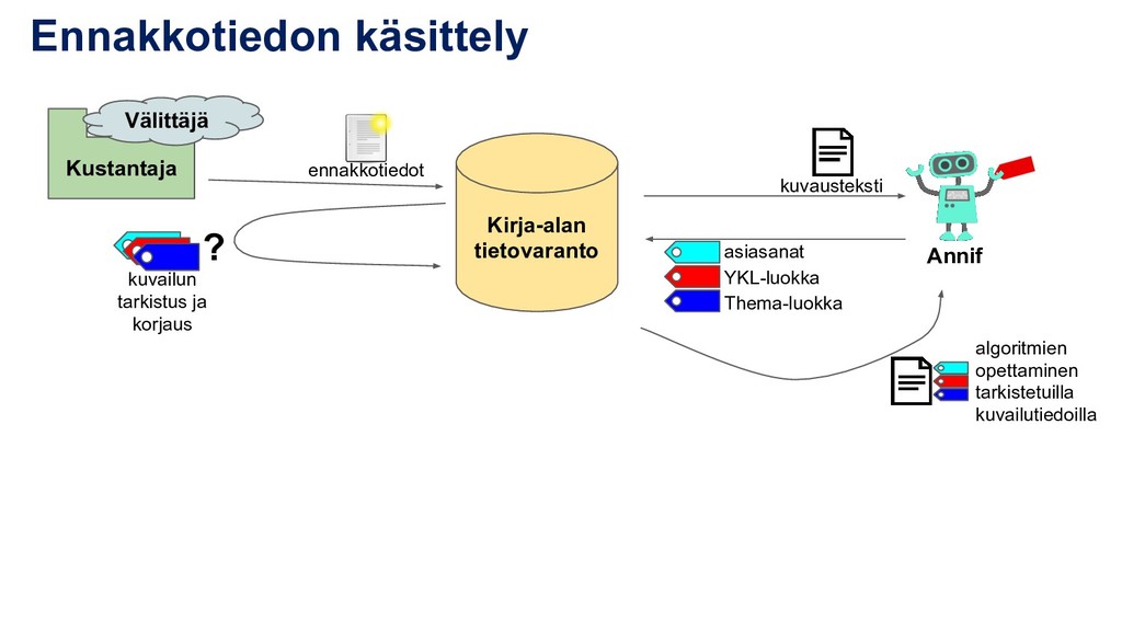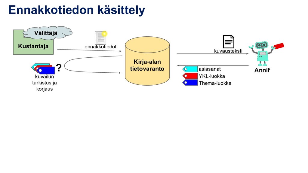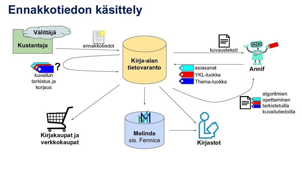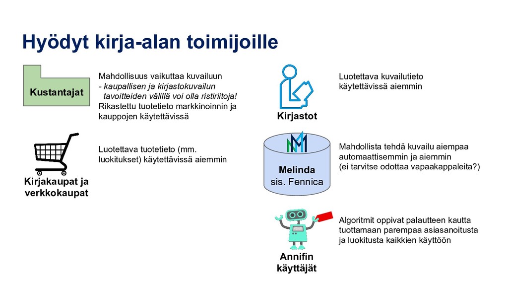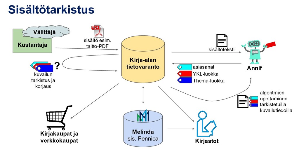 sis. Fennica ? kuvailun tarkistus ja korjaus Kirjastot Kirjakaupat ja verkkokaupat algoritmien opettaminen tarkistetuilla kuvailutiedoilla sisältö esim. taitto-PDF Välittäjä