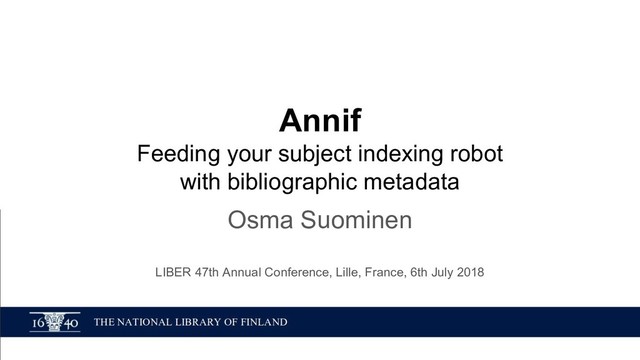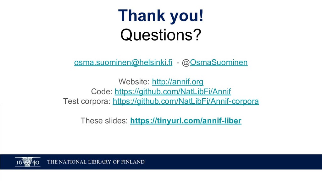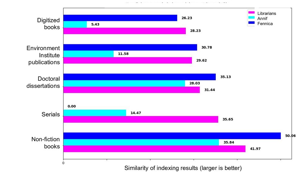 and evaluation • Articles from Arto database (n=6287) Both scientific research papers and less formal publications. Many disciplines. • Master’s and Doctoral theses from Jyväskylä University (n=7400) Long, in-depth scientific documents. Many disciplines. • Question/Answer pairs from an Ask a Librarian service (n=3150) Short, informal questions and answers about many different topics. Available on GitHub: https://github.com/NatLibFi/Annif-corpora (for the first two corpora, only links to PDFs are provided for copyright reasons)