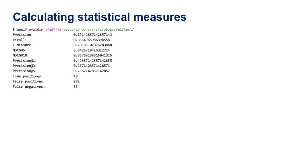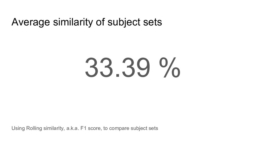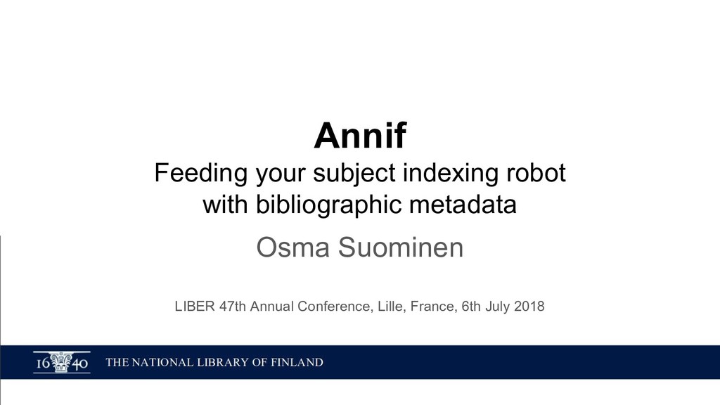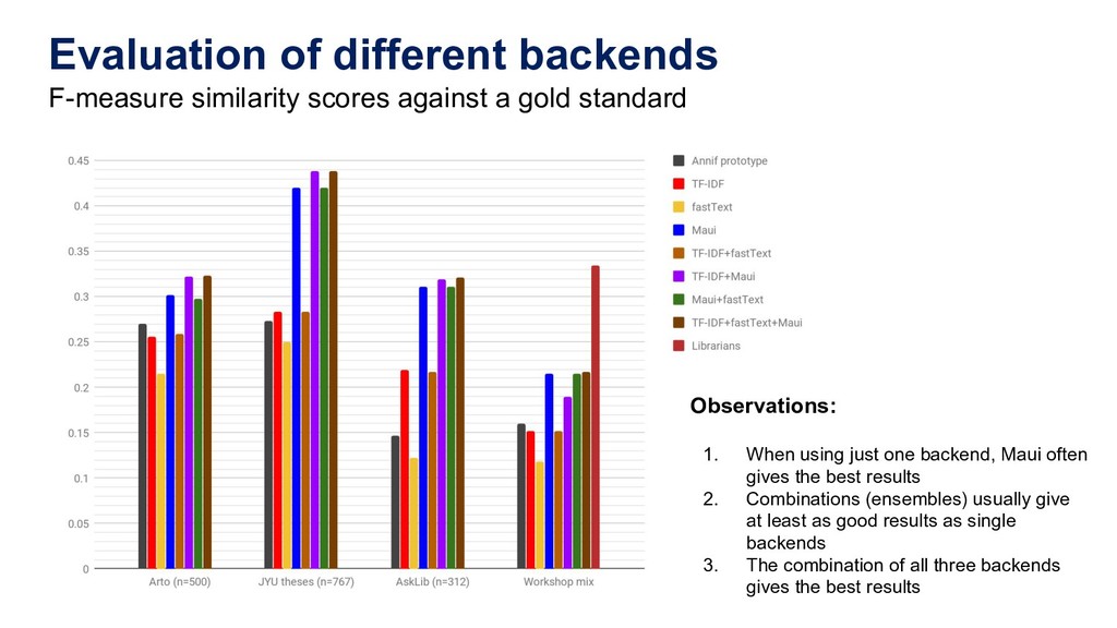 key for training and evaluation Don’t expect good results if you don’t have the data it takes 2. Gold standard subjects are useful, but human evaluation is necessary Subject indexing is inherently subjective; comparing to a single gold standard can be misleading 3. All algorithms have strong and weak points Combinations work better than any algorithm by itself 4. Surprising amount of interest also from non-library organizations Archives, media organizations, book distributors … automation is better done together!