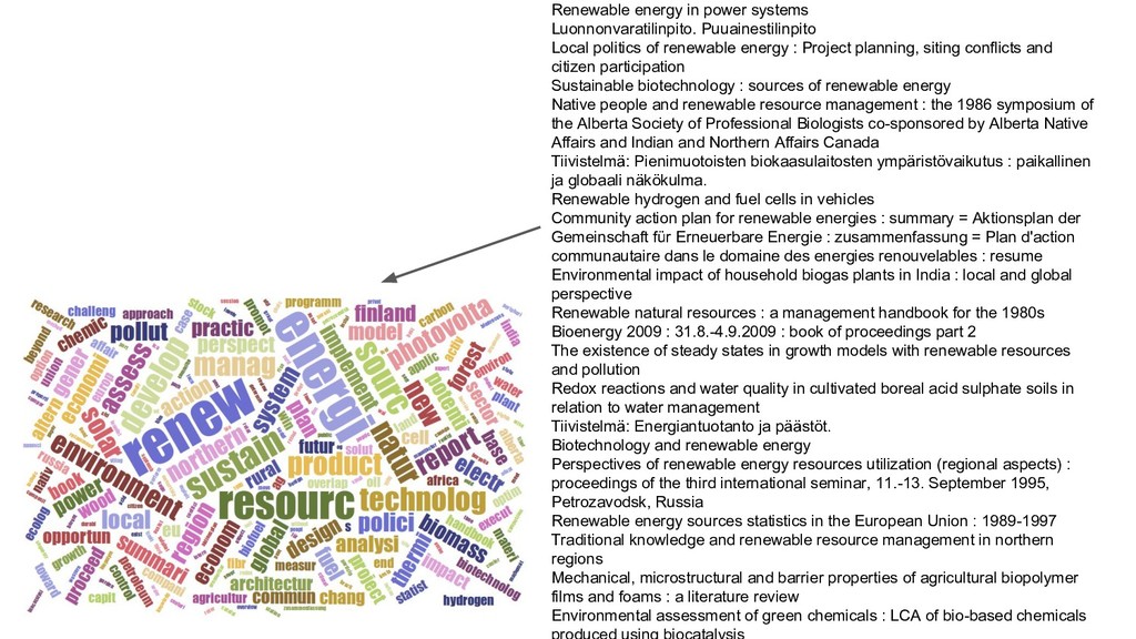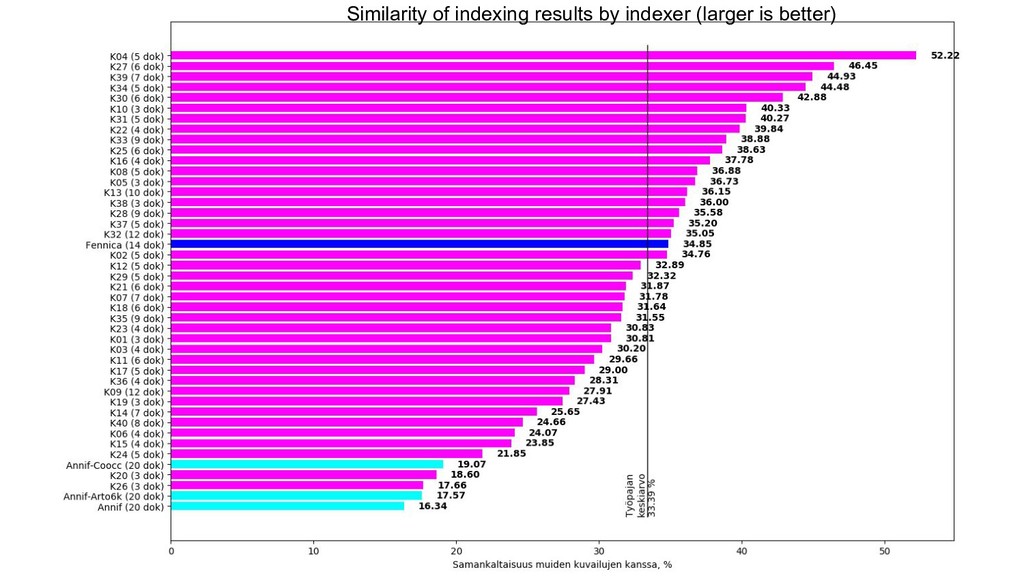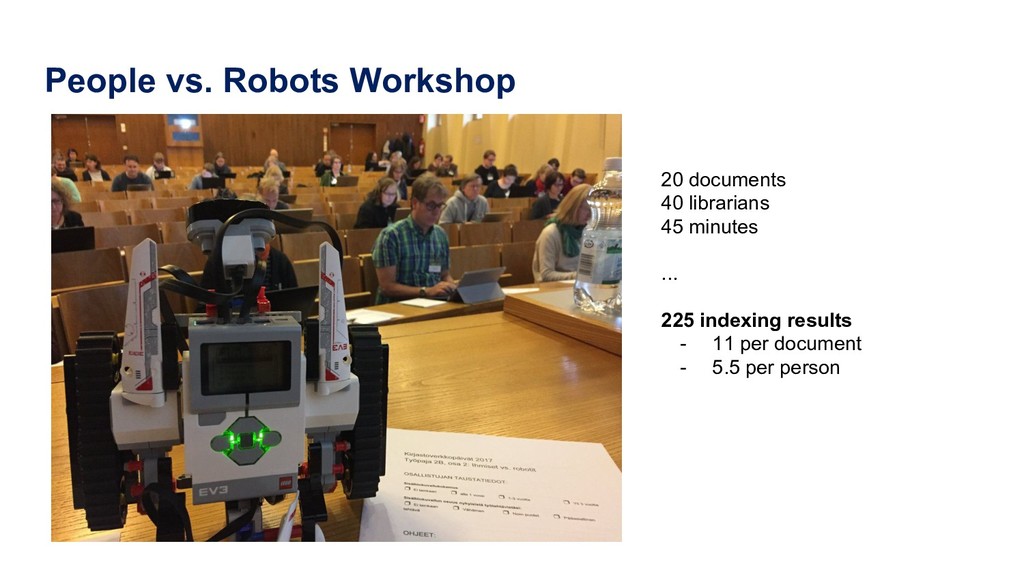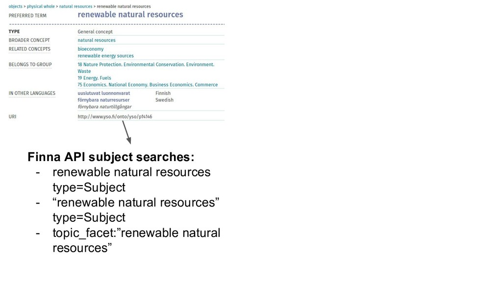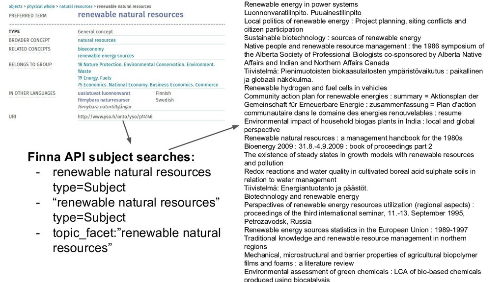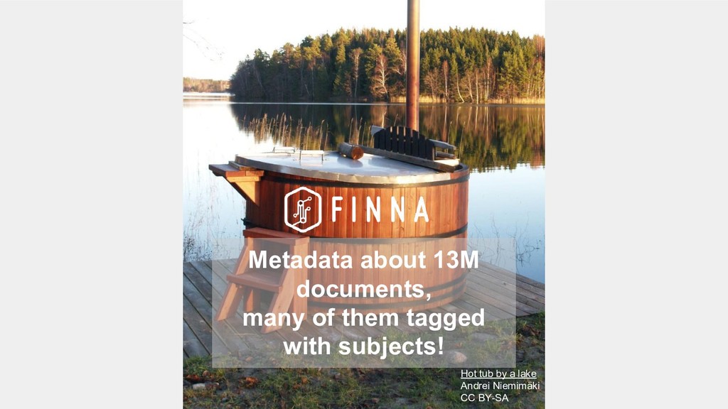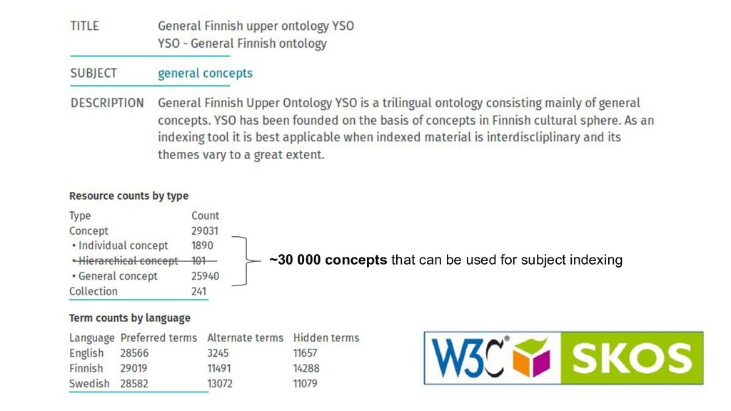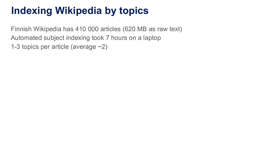 (620 MB as raw text) Automated subject indexing took 7 hours on a laptop 1-3 topics per article (average ~2) Examples: (random sample) Wikipedia article YSO topics Ahvenuslammi (Urjala) shores Brasilian Grand Prix 2016 race drivers, formula racing, karting Guy Topelius folk poetry researcher, saccharin HMS Laforey warships Liigacup football, football players Pää Kii ensembles (groups), pop music RT-21M Pioneer missiles Runoja pop music, recording (music recordings), compositions (music) Sjur Røthe skiers, skiing, Nordic combined Veikko Lavi lyricists, comic songs