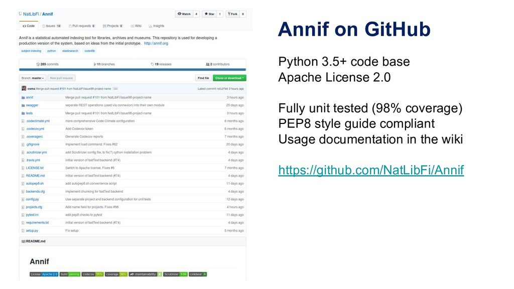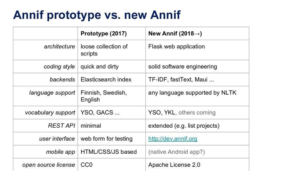 architecture loose collection of scripts Flask web application coding style quick and dirty solid software engineering backends Elasticsearch index TF-IDF, fastText, Maui ... language support Finnish, Swedish, English any language supported by NLTK vocabulary support YSO, GACS ... YSO, YKL, others coming REST API minimal extended (e.g. list projects) user interface web form for testing http://dev.annif.org mobile app HTML/CSS/JS based (native Android app?) open source license CC0 Apache License 2.0