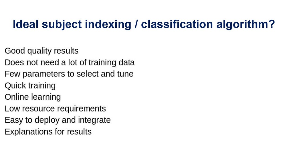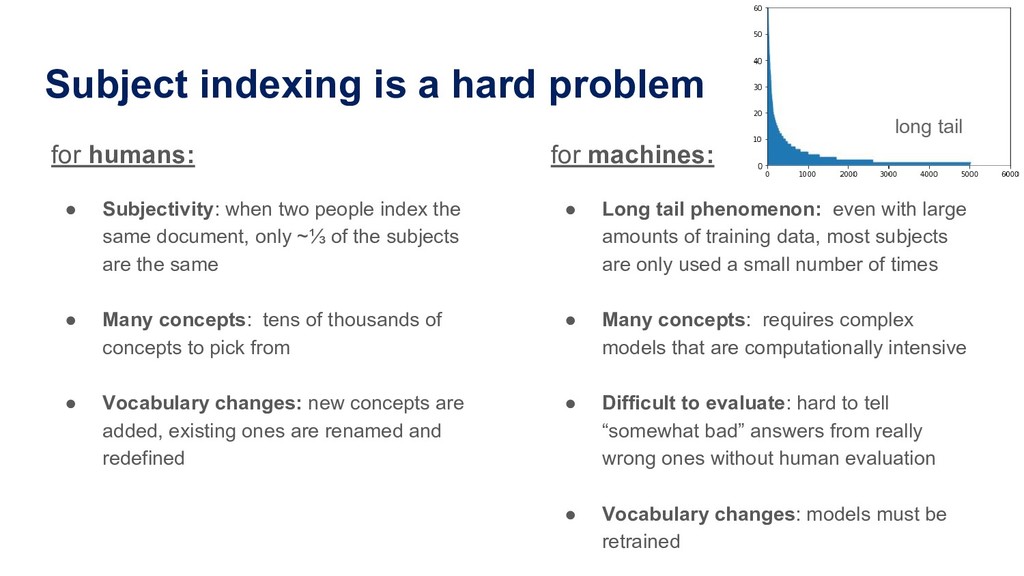 when two people index the same document, only ~⅓ of the subjects are the same • Many concepts: tens of thousands of concepts to pick from • Vocabulary changes: new concepts are added, existing ones are renamed and redefined for machines: • Long tail phenomenon: even with large amounts of training data, most subjects are only used a small number of times • Many concepts: requires complex models that are computationally intensive • Difficult to evaluate: hard to tell “somewhat bad” answers from really wrong ones without human evaluation • Vocabulary changes: models must be retrained long tail