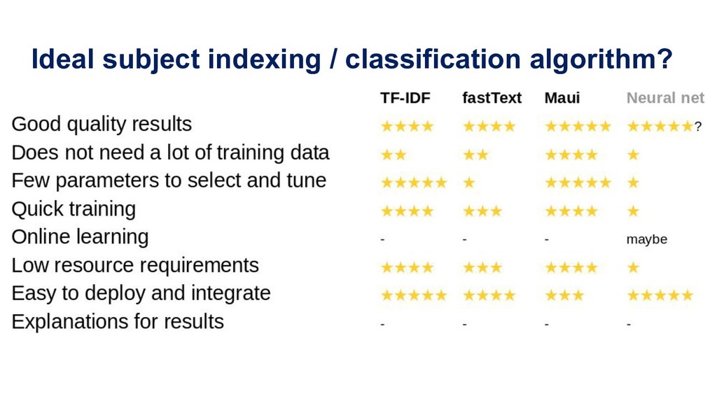 Implemented with the Gensim library. • fastText by Facebook Research Machine learning algorithm for text classification. Uses word embeddings (similar to word2vec) and resembles a neural network architecture. Promises to be good for e.g. library classifications (DDC, UDC, YKL…) • HTTP backend for accessing MauiService REST API MauiService is a microservice wrapper around the Maui automated indexing tool. Based on traditional Natural Language Processing techniques - finds terms within text.