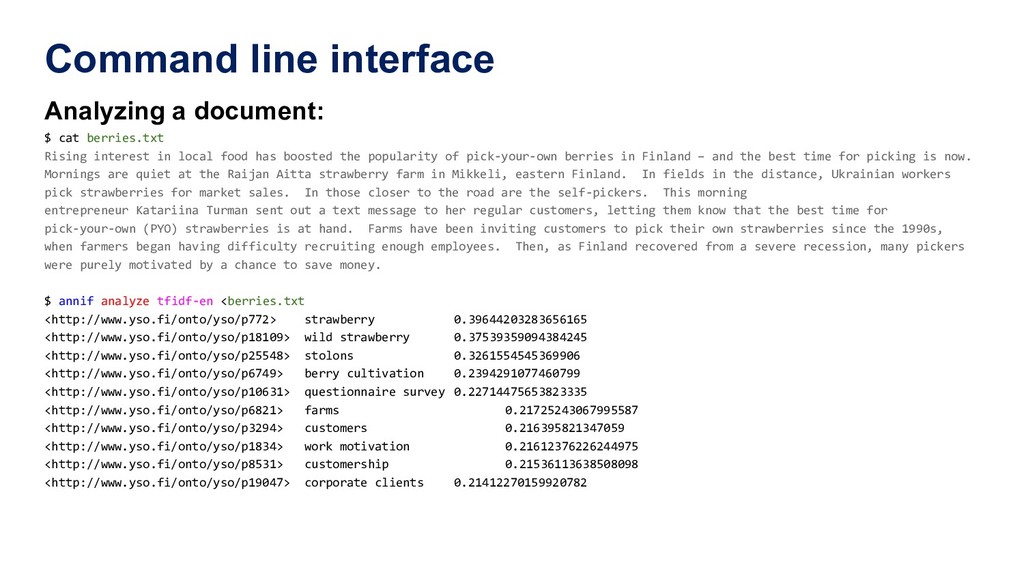 interest in local food has boosted the popularity of pick-your-own berries in Finland – and the best time for picking is now. Mornings are quiet at the Raijan Aitta strawberry farm in Mikkeli, eastern Finland. In fields in the distance, Ukrainian workers pick strawberries for market sales. In those closer to the road are the self-pickers. This morning entrepreneur Katariina Turman sent out a text message to her regular customers, letting them know that the best time for pick-your-own (PYO) strawberries is at hand. Farms have been inviting customers to pick their own strawberries since the 1990s, when farmers began having difficulty recruiting enough employees. Then, as Finland recovered from a severe recession, many pickers were purely motivated by a chance to save money. $ annif analyze tfidf-en <berries.txt <http://www.yso.fi/onto/yso/p772> strawberry 0.39644203283656165 <http://www.yso.fi/onto/yso/p18109> wild strawberry 0.37539359094384245 <http://www.yso.fi/onto/yso/p25548> stolons 0.3261554545369906 <http://www.yso.fi/onto/yso/p6749> berry cultivation 0.2394291077460799 <http://www.yso.fi/onto/yso/p10631> questionnaire survey 0.22714475653823335 <http://www.yso.fi/onto/yso/p6821> farms 0.21725243067995587 <http://www.yso.fi/onto/yso/p3294> customers 0.216395821347059 <http://www.yso.fi/onto/yso/p1834> work motivation 0.21612376226244975 <http://www.yso.fi/onto/yso/p8531> customership 0.21536113638508098 <http://www.yso.fi/onto/yso/p19047> corporate clients 0.21412270159920782