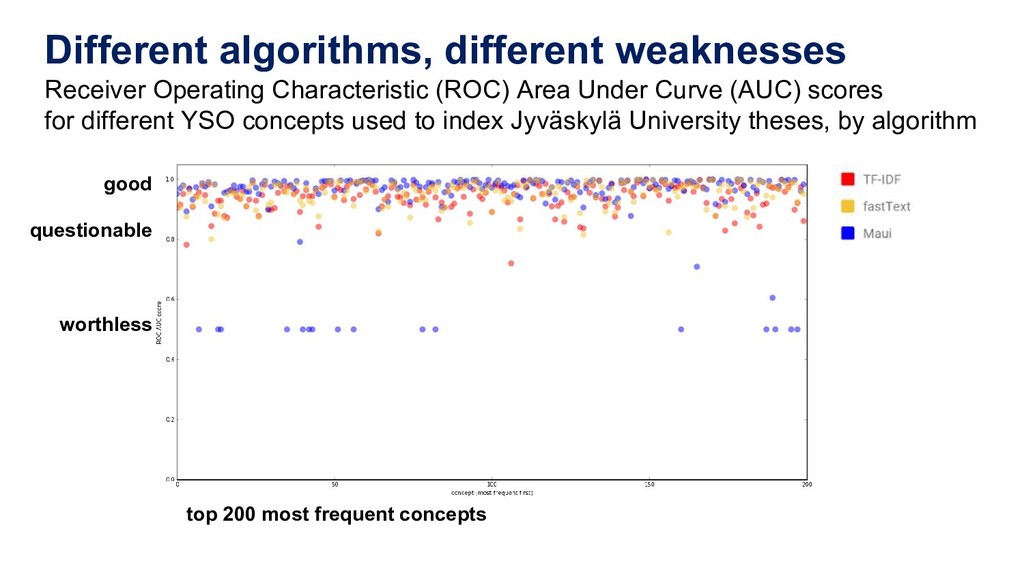 Curve (AUC) scores for different YSO concepts used to index Jyväskylä University theses, by algorithm good questionable worthless top 200 most frequent concepts