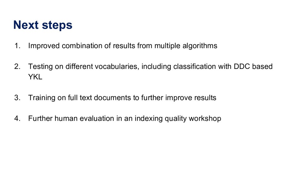 2. Testing on different vocabularies, including classification with DDC based YKL 3. Training on full text documents to further improve results 4. Further human evaluation in an indexing quality workshop