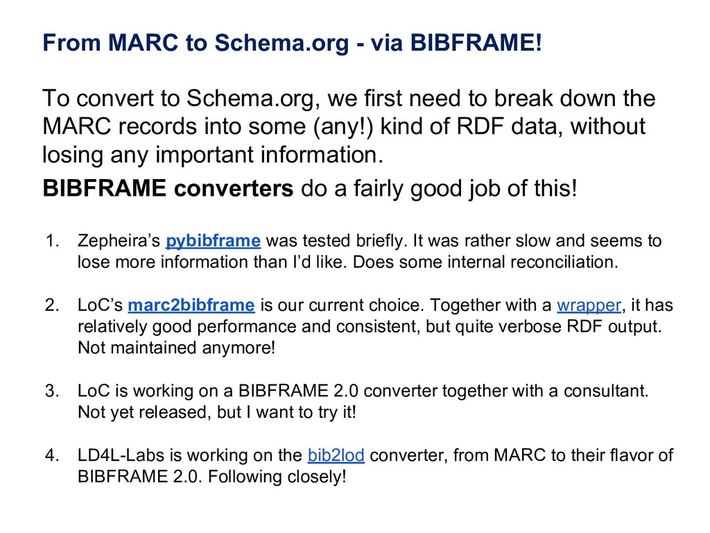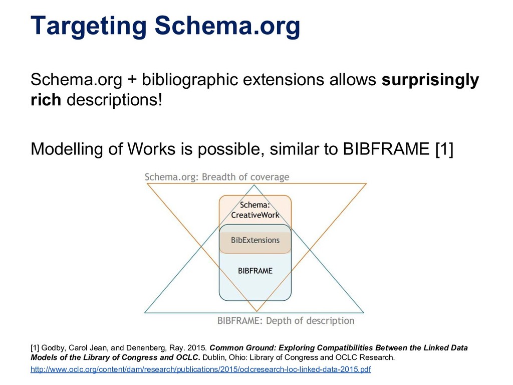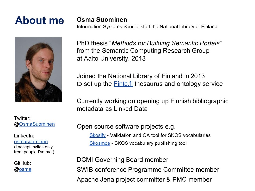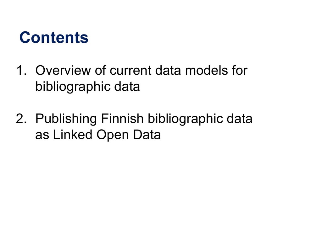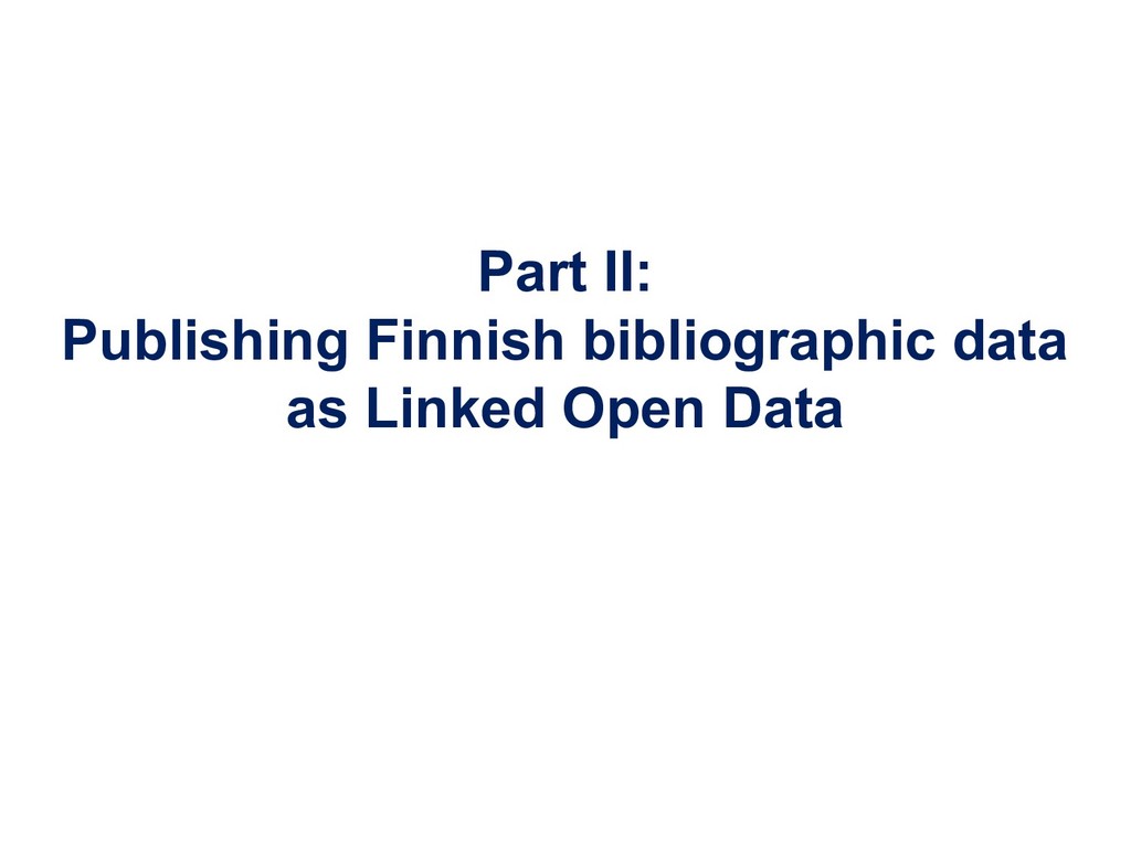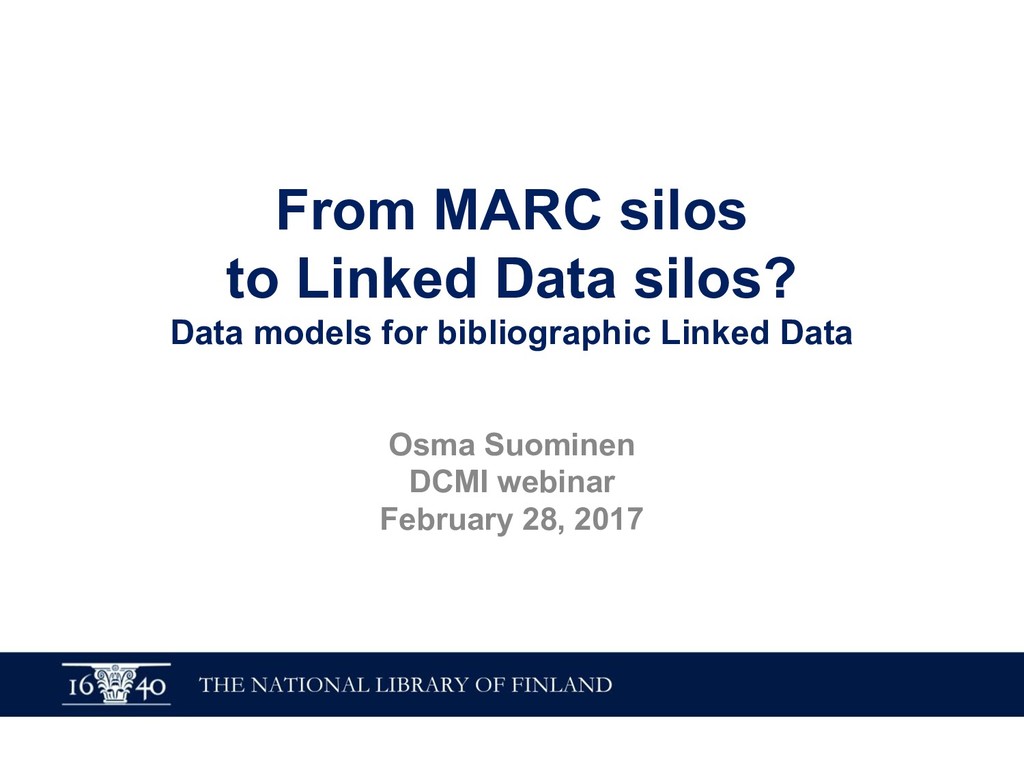 In this webinar, by Osma Suominen of the National Library of Finland, will present: (1) a survey of published bibliographic Linked Data, the data models proposed for representing bibliographic data as RDF, and tools used for conversion from MARC records; (2) an analysis of different use cases for bibliographic Linked Data and how they affect the data model; and (3) recommendations for choosing a data model.