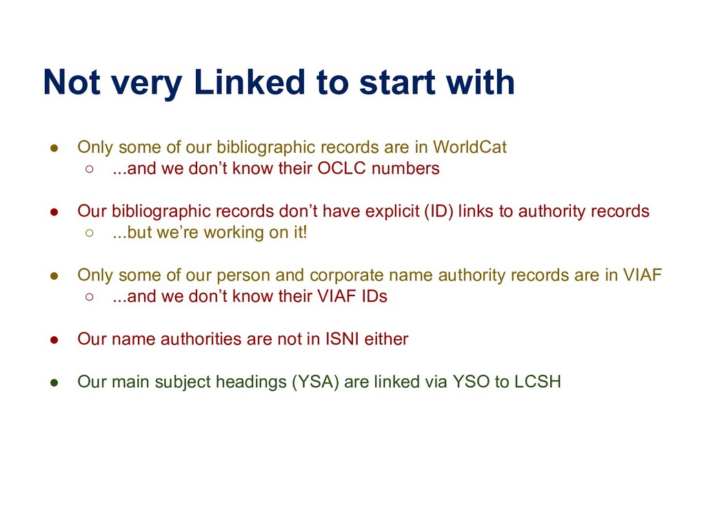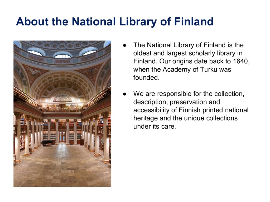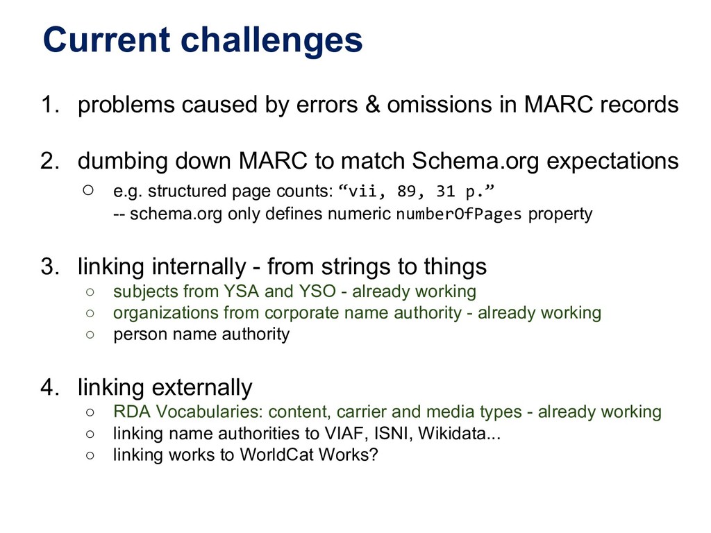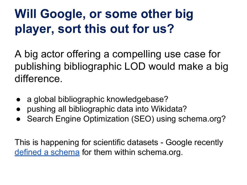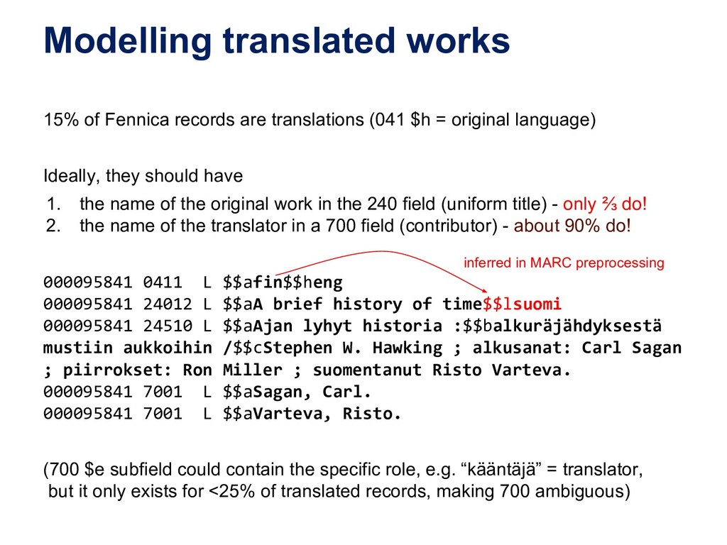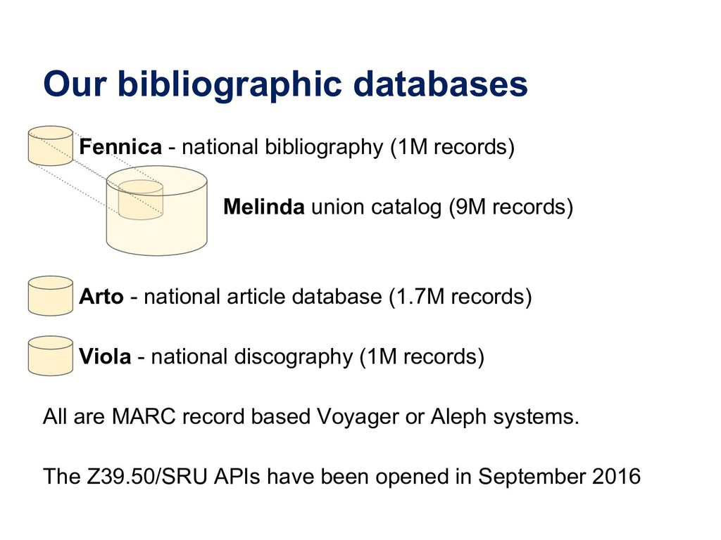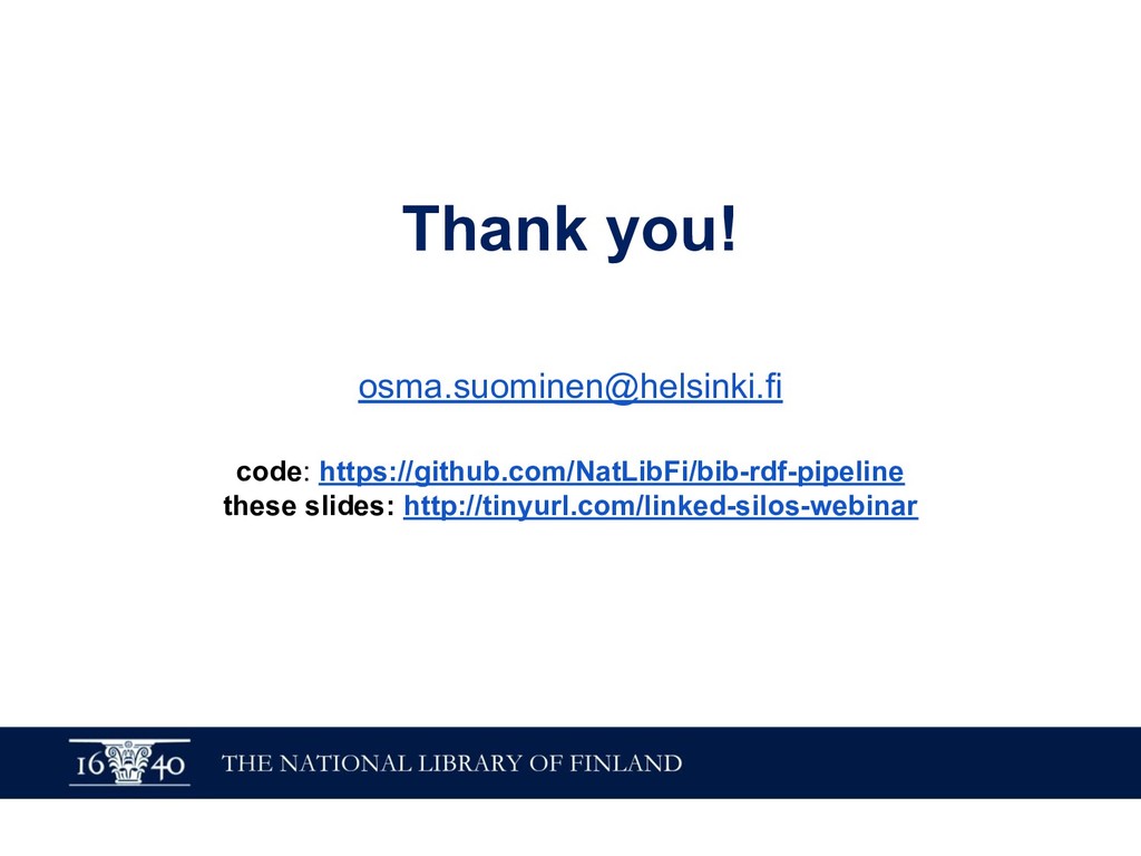 In this webinar, by Osma Suominen of the National Library of Finland, will present: (1) a survey of published bibliographic Linked Data, the data models proposed for representing bibliographic data as RDF, and tools used for conversion from MARC records; (2) an analysis of different use cases for bibliographic Linked Data and how they affect the data model; and (3) recommendations for choosing a data model.