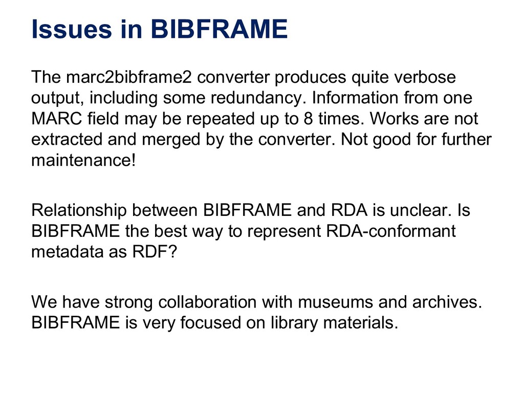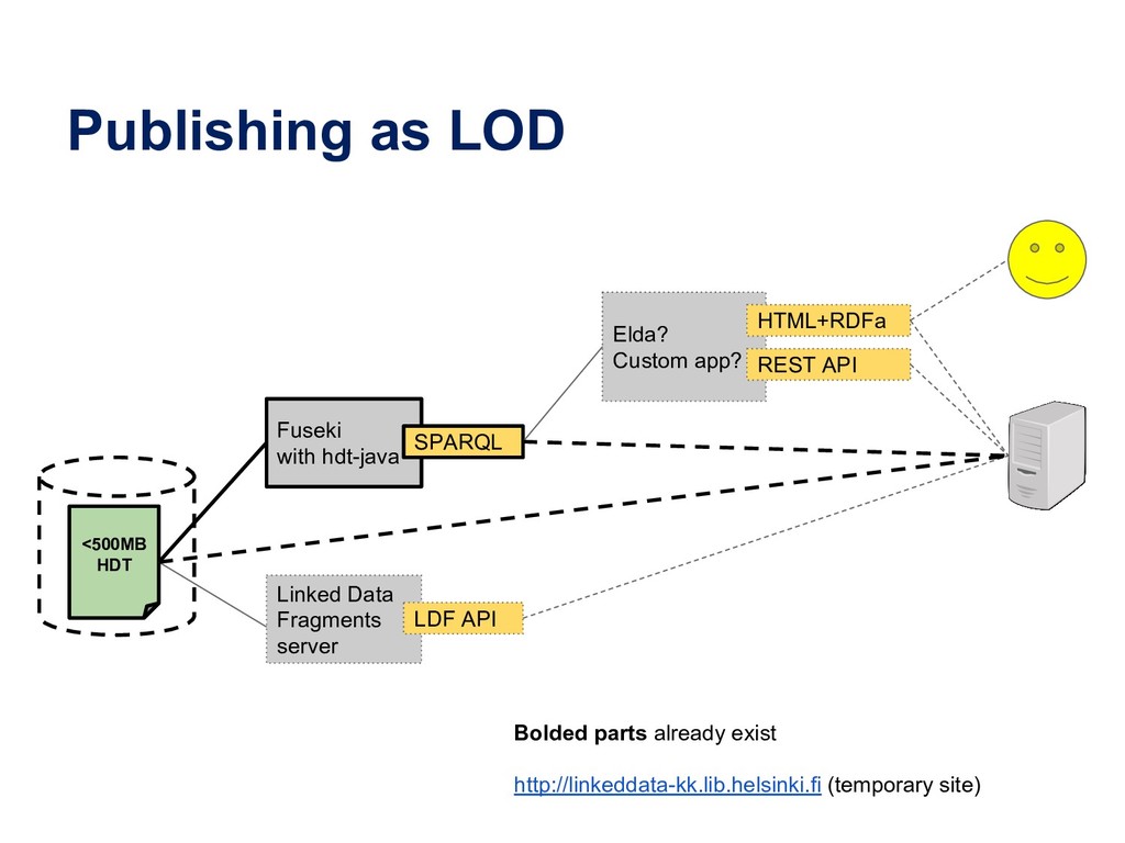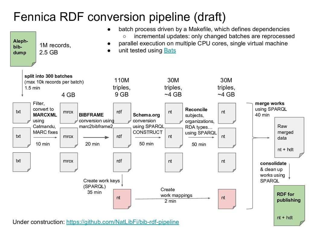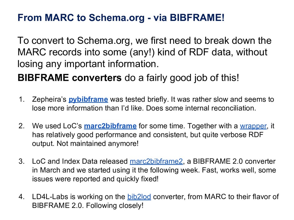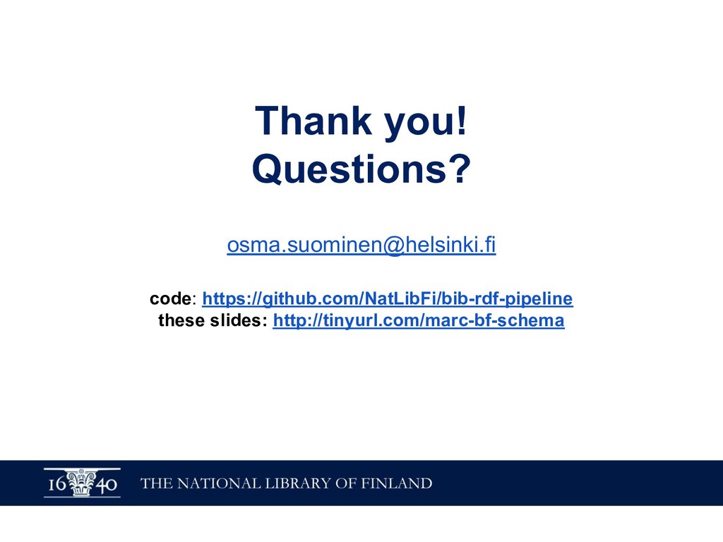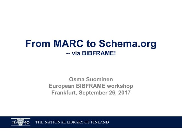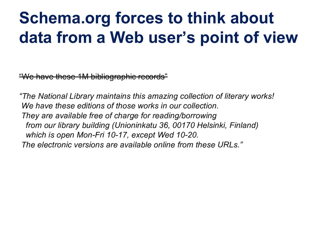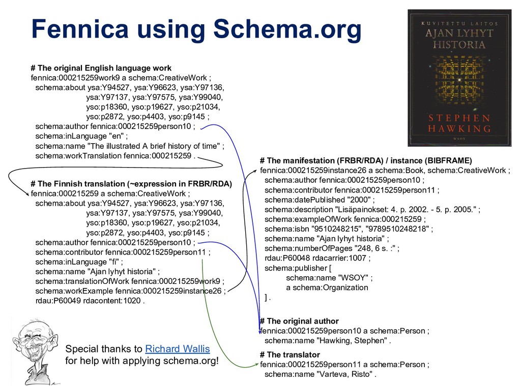 a schema:CreativeWork ; schema:about ysa:Y94527, ysa:Y96623, ysa:Y97136, ysa:Y97137, ysa:Y97575, ysa:Y99040, yso:p18360, yso:p19627, yso:p21034, yso:p2872, yso:p4403, yso:p9145 ; schema:author fennica:000215259person10 ; schema:inLanguage "en" ; schema:name "The illustrated A brief history of time" ; schema:workTranslation fennica:000215259 . # The Finnish translation (~expression in FRBR/RDA) fennica:000215259 a schema:CreativeWork ; schema:about ysa:Y94527, ysa:Y96623, ysa:Y97136, ysa:Y97137, ysa:Y97575, ysa:Y99040, yso:p18360, yso:p19627, yso:p21034, yso:p2872, yso:p4403, yso:p9145 ; schema:author fennica:000215259person10 ; schema:contributor fennica:000215259person11 ; schema:inLanguage "fi" ; schema:name "Ajan lyhyt historia" ; schema:translationOfWork fennica:000215259work9 ; schema:workExample fennica:000215259instance26 ; rdau:P60049 rdacontent:1020 . # The manifestation (FRBR/RDA) / instance (BIBFRAME) fennica:000215259instance26 a schema:Book, schema:CreativeWork ; schema:author fennica:000215259person10 ; schema:contributor fennica:000215259person11 ; schema:datePublished "2000" ; schema:description "Lisäpainokset: 4. p. 2002. - 5. p. 2005." ; schema:exampleOfWork fennica:000215259 ; schema:isbn "9510248215", "9789510248218" ; schema:name "Ajan lyhyt historia" ; schema:numberOfPages "248, 6 s. :" ; rdau:P60048 rdacarrier:1007 ; schema:publisher [ schema:name "WSOY" ; a schema:Organization ] . # The original author fennica:000215259person10 a schema:Person ; schema:name "Hawking, Stephen" . # The translator fennica:000215259person11 a schema:Person ; schema:name "Varteva, Risto" . Special thanks to Richard Wallis for help with applying schema.org!