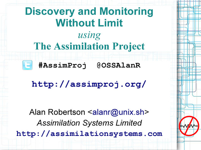 Is Futile! #AssimProj @OSSAlanR #AssimMon Project Web Site http://assimproj.org Blog techthoughts.typepad.com lists.community.tummy.com/cgi-bin/mailman/admin/assimilation