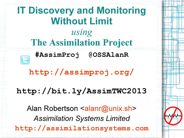 Is Futile! #AssimProj @OSSAlanR #AssimMon Project Web Site http://assimproj.org Blog techthoughts.typepad.com lists.community.tummy.com/cgi-bin/mailman/admin/assimilation