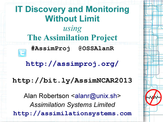Resistance Is Futile! #AssimProj @OSSAlanR #AssimMon Project Web Site http://assimproj.org Blog techthoughts.typepad.com lists.community.tummy.com/cgi-bin/mailman/admin/assimilation