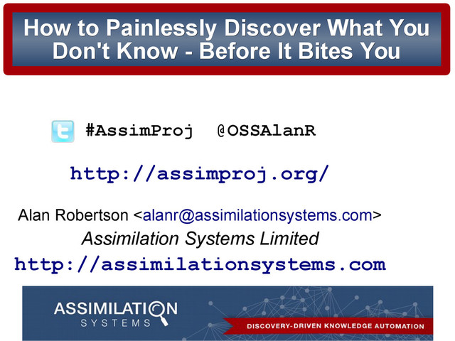 What You Don't Know - Before It Bites You Don't Know - Before It Bites You #AssimProj @OSSAlanR http://assimproj.org/ Alan Robertson <[email protected]> Assimilation Systems Limited http://assimilationsystems.com
