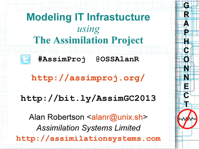 G R A P H C O N N E C T Resistance Is Futile! #AssimProj @OSSAlanR #AssimMon Project Web Site http://assimproj.org Blog techthoughts.typepad.com lists.community.tummy.com/cgi-bin/mailman/admin/assimilation