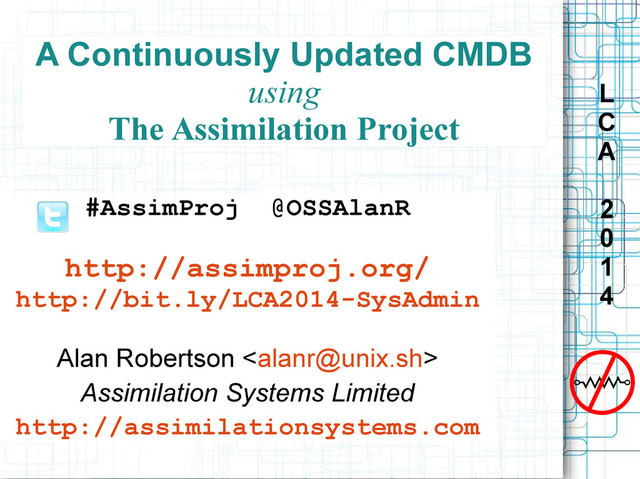 Assimilation Systems Limited 14/18 L C A 2 0 1 4 Resistance Is Futile! Mailing List bit.ly/AssimML #AssimProj @OSSAlanR Project Web Site assimproj.org Blog techthoughts.typepad.com assimilationsystems.com