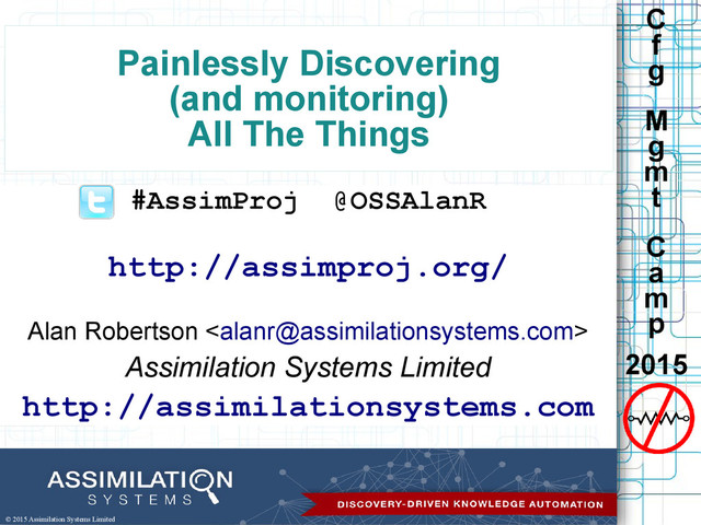 A dirty little secret in IT is that we don’t always know everything we have, what our systems are doing or fully monitor them. The Assimilation Project integrates continuous discovery and monitoring, creating a graph CMDB of your infrastructure and services - scalably monitoring them with near-zero configuration. Come learn how to easily put your infrastructure knowledge in one place, monitor your systems, services and configurations, and automatically update it and examine it against best practices.