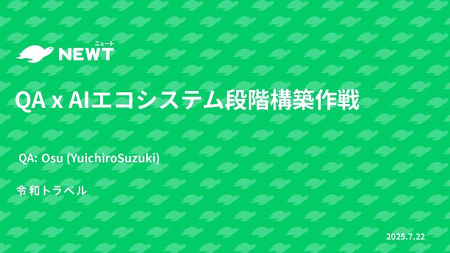 ) ・WEB - React/Next/TS ・iOS - Swift/TCA/Swift UI ・Android - Kotlin/JetpackCompose 人員: 開発メンバー30名ほど(QA 4名) 開発プロセス :アジャイル開発 想定投資: 正社員1名・80%コミット 方針: 高速実証優先でPoCサイクルを回して最短 装着優先 ツール類: Notion: 仕様整理, Figma: デザイン JIRA:タスク/不具合管理 , Github/GHA: 開発 📋 テスト基盤の現状と前提条件 ・技術基盤現状 WEB: リグレッションテスト自動化率 100%(9月末予 定) iOS/Android: 平均リグレッションテスト自動化率 40%(9月末予定) CI/CD: WEB:運用中 / Native:PoC段階 ・制約 リリース頻度 : Native週次(審査制約)/ WEBは一定影 響範囲以上の修正は週次、それ以外は日次 品質要件 : 決済・予約・料金表示はより厳密に定義。 他はUI/UXガイドラインや品質要件、インシデント基準 に準拠 📝 AI組み込み環境 9
