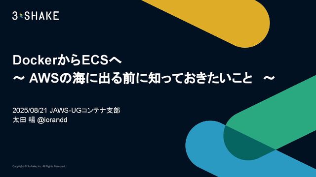 DockerからECSへ 〜 AWSの海に出る前に知っておきたいこと 〜 2025/08/21 JAWS-UGコンテナ支部 太田 暢 @iorandd Copyright