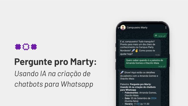 informações sobre o cronograma do evento e responder a dúvidas. Foram fornecidas informações de: - cronograma: com informações de data, horário e conteúdo das palestras da campus; e - dúvidas gerais: baseado na FAQ da campus party, Marty pode oferecer respostas para as principais dúvidas sobre o evento.