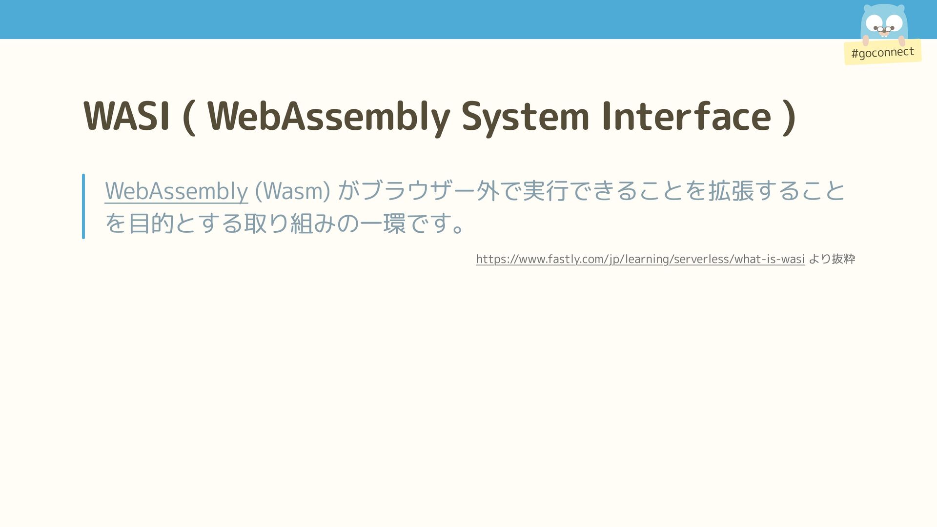 #goconnect WASI ( WebAssembly System Interface ) WebAssembly (Wasm) がブラウザー外で実行できることを拡張すること