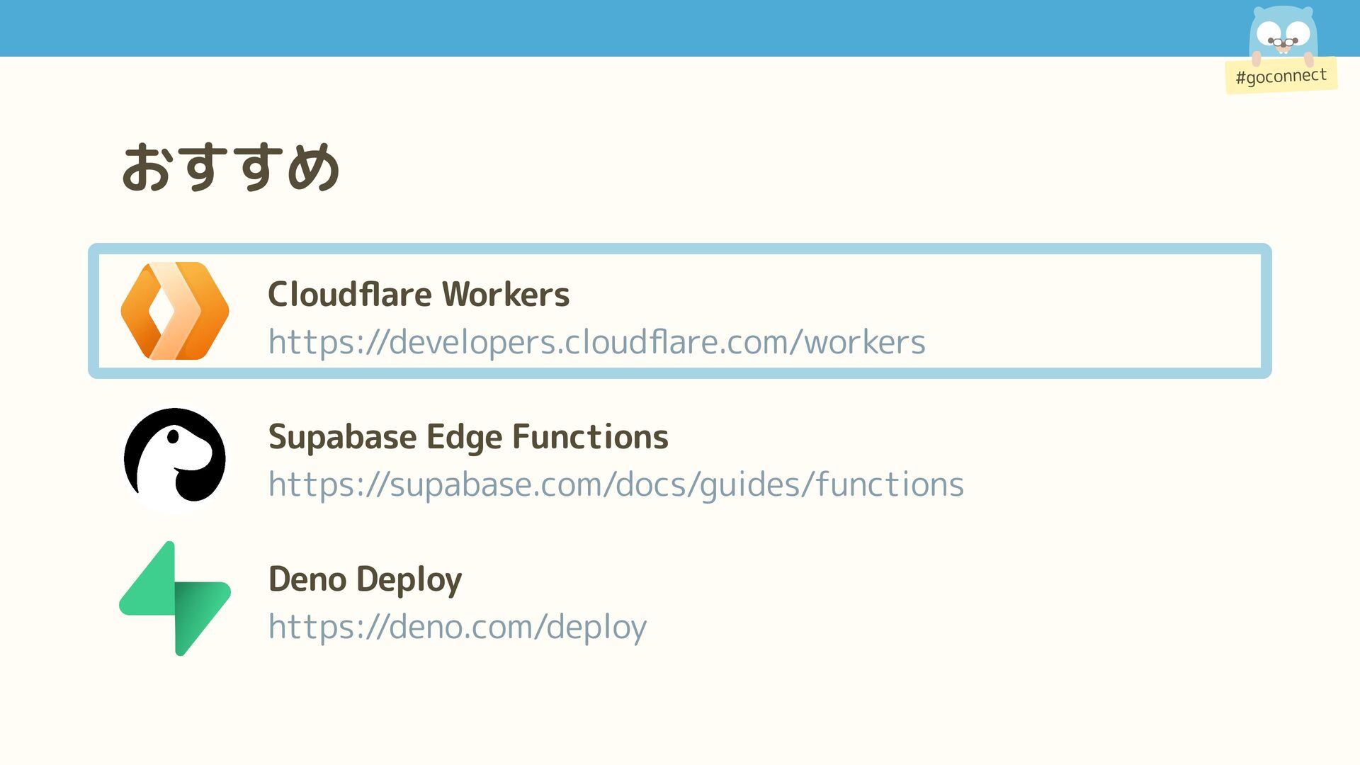 #goconnect おすすめ Cloudflare Workers Supabase Edge Functions Deno Deploy https://developers.cloudflare.com/workers