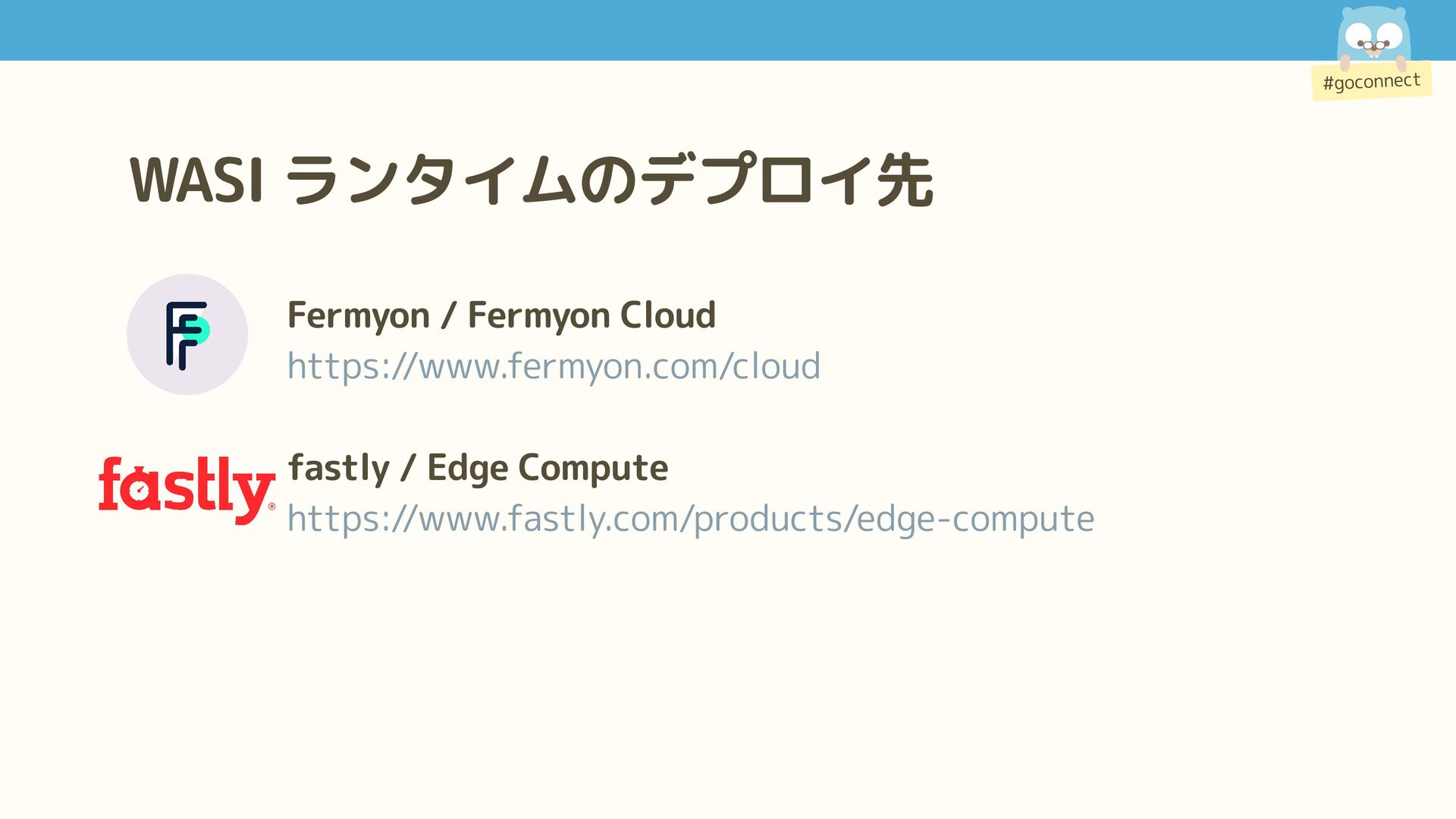#goconnect WASI ランタイムのデプロイ先 Fermyon / Fermyon Cloud fastly / Edge