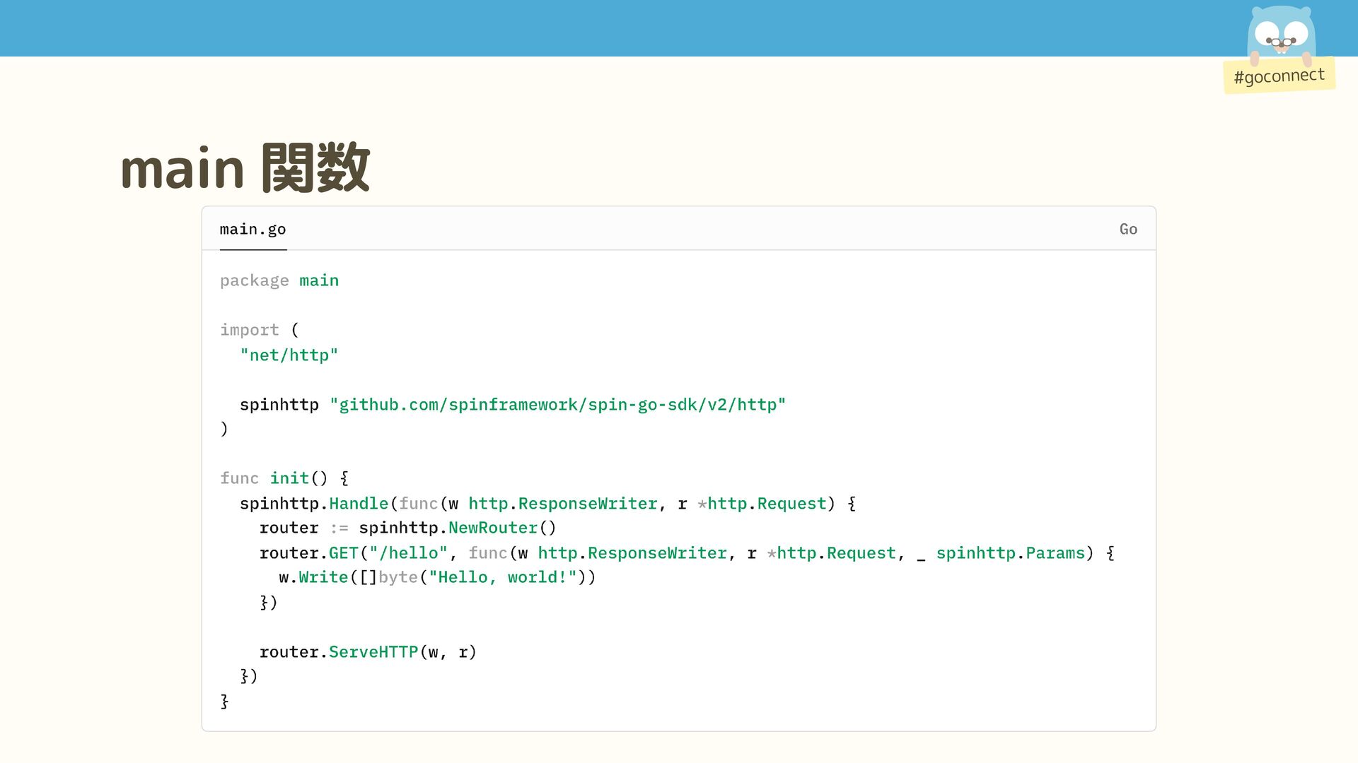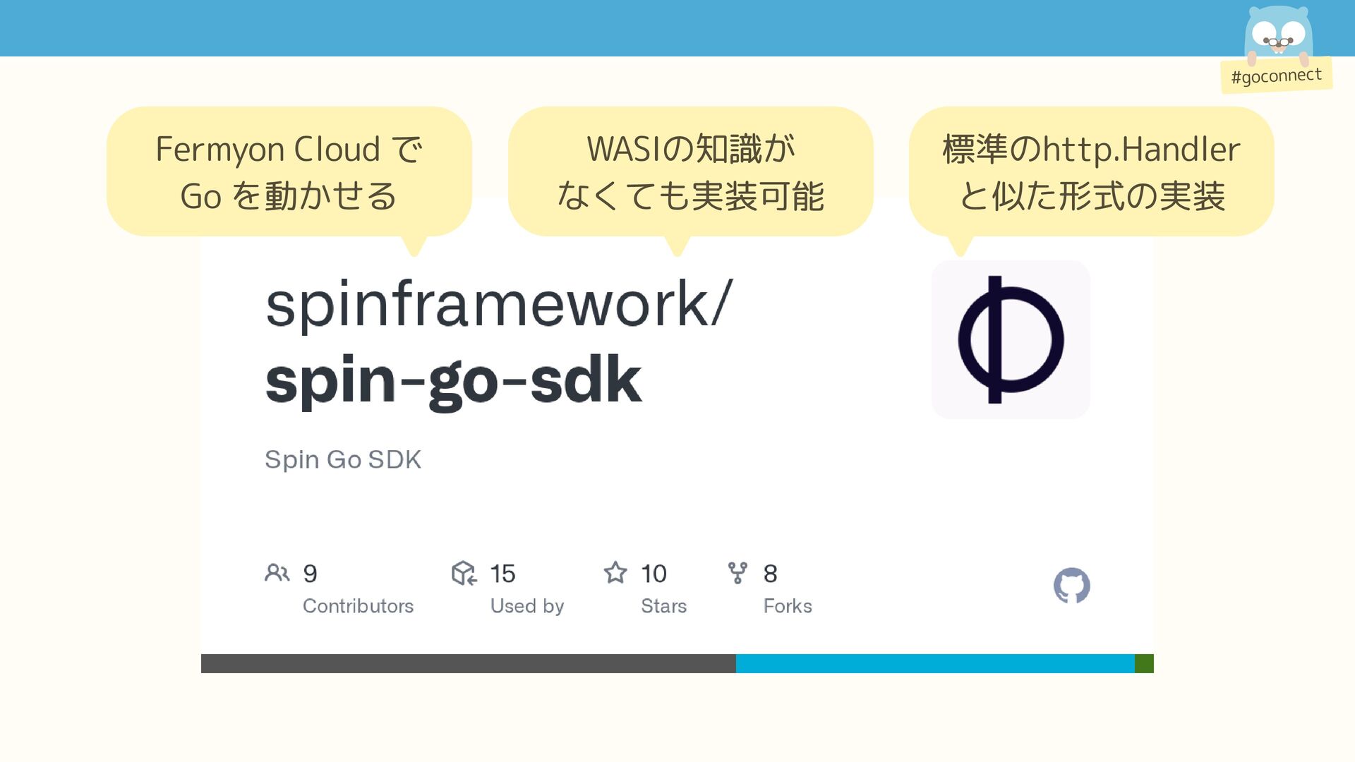 #goconnect Fermyon Cloud で Go を動かせる 標準のhttp.Handler と似た形式の実装 WASIの知識が なくても実装可能