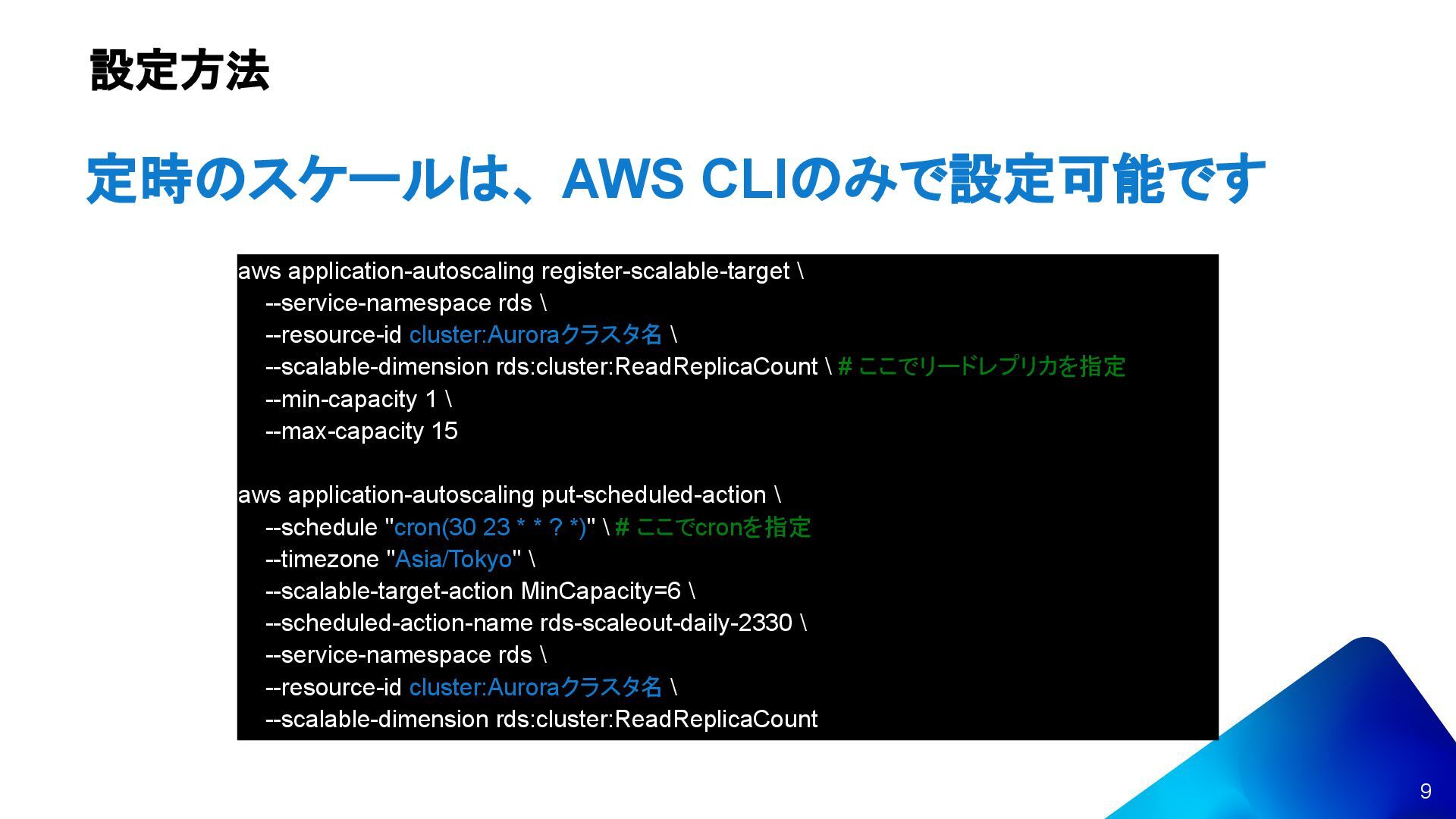--scalable-dimension rds:cluster:ReadReplicaCount { ~割愛~ { "ScheduledActionName": "rds-scaleout-daily-2330", "ScheduledActionARN": "arn:aws:autoscaling:ap-northeast-1:XXXX:scheduledAction:XXXX:resource/rds/cluster: クラスタ名:scheduledActionName/rds-scaleout-daily-2330", "ServiceNamespace": "rds", "Schedule": "cron(30 23 * * ? *)", "Timezone": "Asia/Tokyo", "ResourceId": "cluster:クラスタ名", "ScalableDimension": "rds:cluster:ReadReplicaCount", "ScalableTargetAction": { "MinCapacity": 6 }, "CreationTime": "2025-04-11T17:53:06.353000+09:00" },
