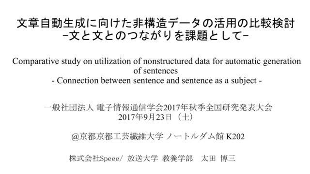 ビックデータの時代が到来して数年が経過し,ここ数年の深層学習の発展は目覚しいものがある.画像処理や音声認識はその恩恵を受けているが,自然言語処理の文と文とのつながりの分野では見受けられないように思われる.そこで実務で通用する,自然な文章生成の各手法の比較検討を行い,未来への糸口を見出したい.1)マルコフ連鎖,2)自動要約,3)ディープラーニング(RNN/ LSTM/ GAN)による文章生成を予定している.