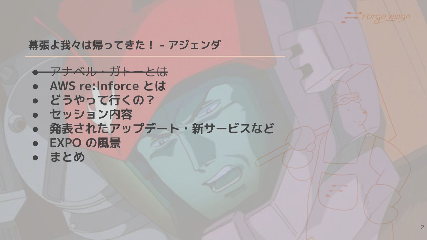 幕張よ我々は帰ってきた! - アジェンダ • アナベル・ガトーとは • AWS re:Inforce とは •