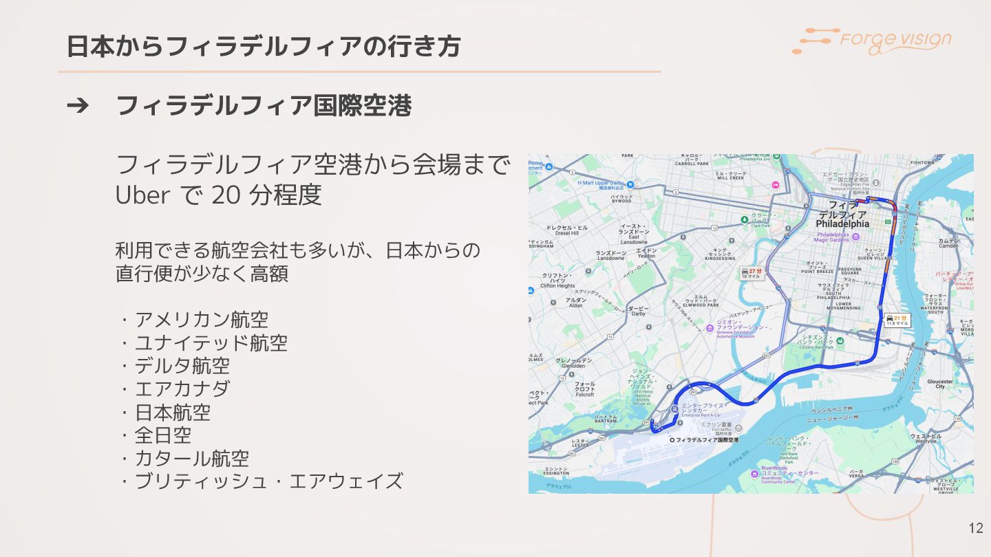日本からフィラデルフィアの行き方 ➔ フィラデルフィア国際空港 フィラデルフィア空港から会場まで Uber で 20 分程度 利用できる航空会社も多いが、日本からの 直行便が少なく高額
