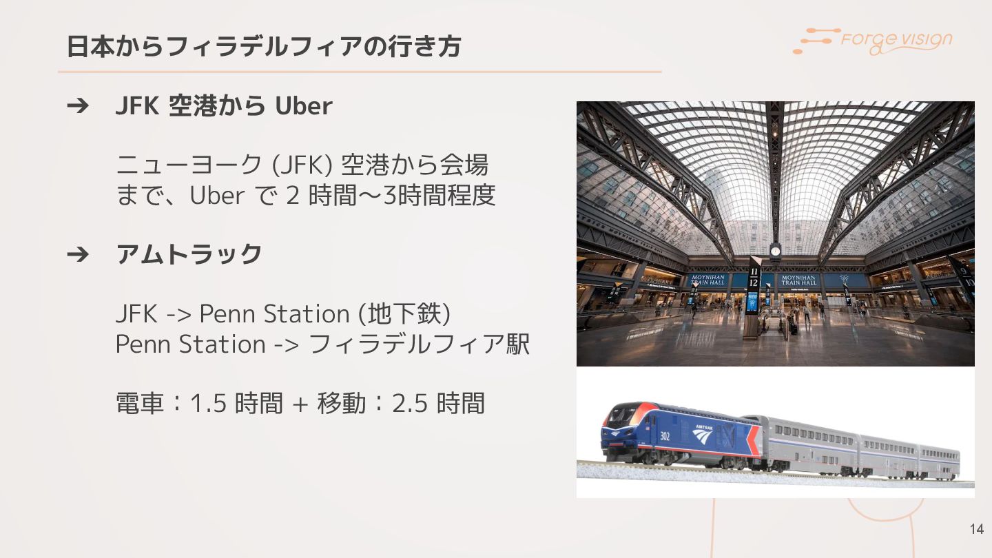 2 時間〜3時間程度 ➔ アムトラック JFK -> Penn Station (地下鉄) Penn Station -> フィラデルフィア駅 電車:1.5 時間 + 移動:2.5 時間 14