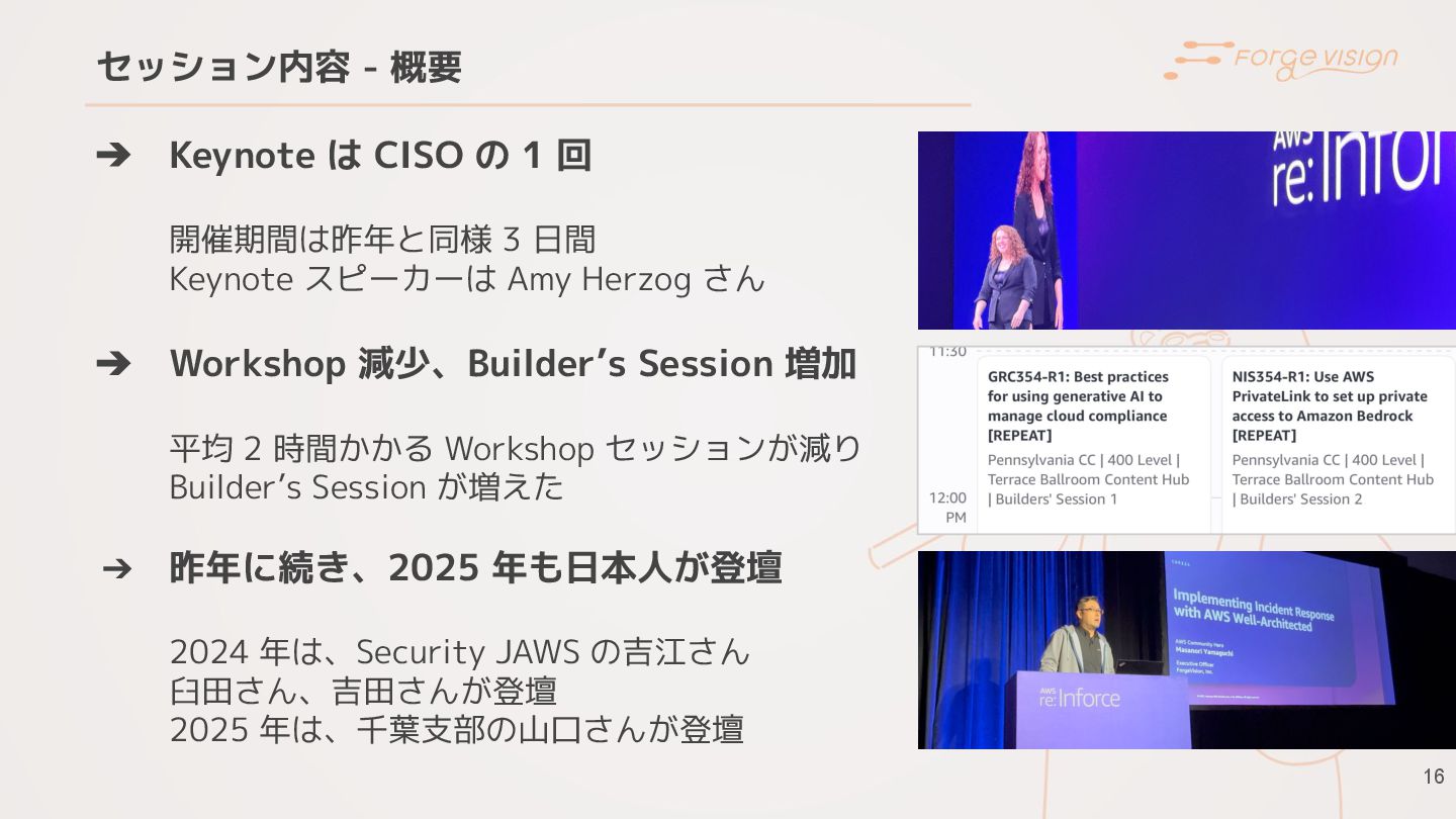 開催期間は昨年と同様 3 日間 Keynote スピーカーは Amy Herzog さん ➔ Workshop 減少、Builder’s Session 増加 平均 2 時間かかる Workshop セッションが減り Builder’s Session が増えた ➔ 昨年に続き、2025 年も日本人が登壇 2024 年は、Security JAWS の吉江さん 臼田さん、吉田さんが登壇 2025 年は、千葉支部の山口さんが登壇 16