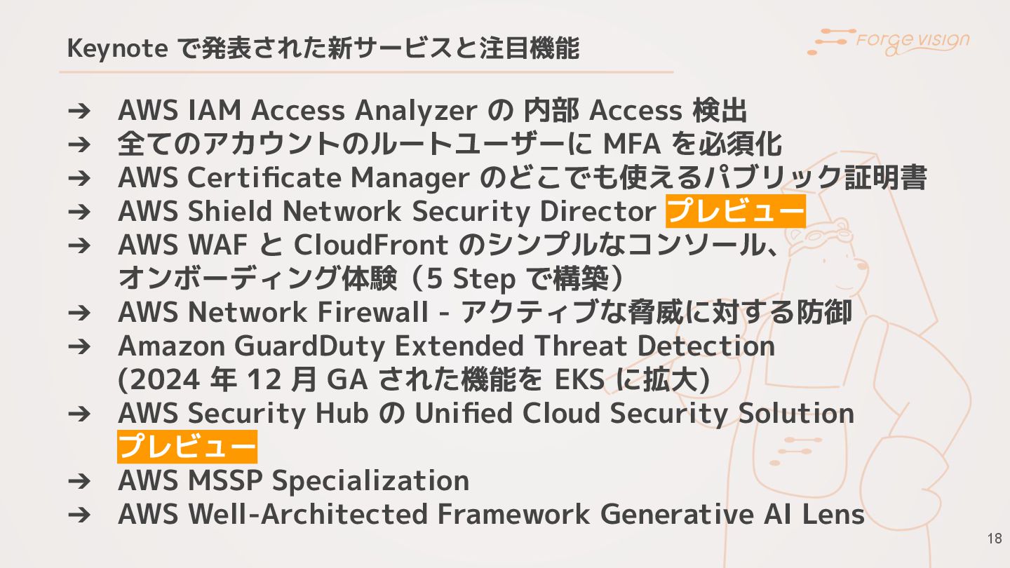 検出 ➔ 全てのアカウントのルートユーザーに MFA を必須化 ➔ AWS Certificate Manager のどこでも使えるパブリック証明書 ➔ AWS Shield Network Security Director プレビュー ➔ AWS WAF と CloudFront のシンプルなコンソール、 オンボーディング体験(5 Step で構築) ➔ AWS Network Firewall - アクティブな脅威に対する防御 ➔ Amazon GuardDuty Extended Threat Detection (2024 年 12 月 GA された機能を EKS に拡大) ➔ AWS Security Hub の Unified Cloud Security Solution プレビュー ➔ AWS MSSP Specialization ➔ AWS Well-Architected Framework Generative AI Lens 18