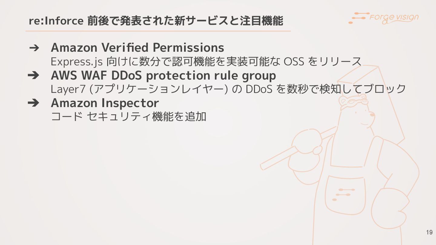 ➔ AWS WAF DDoS protection rule group Layer7 (アプリケーションレイヤー) の DDoS を数秒で検知してブロック ➔ Amazon Inspector コード セキュリティ機能を追加 19
