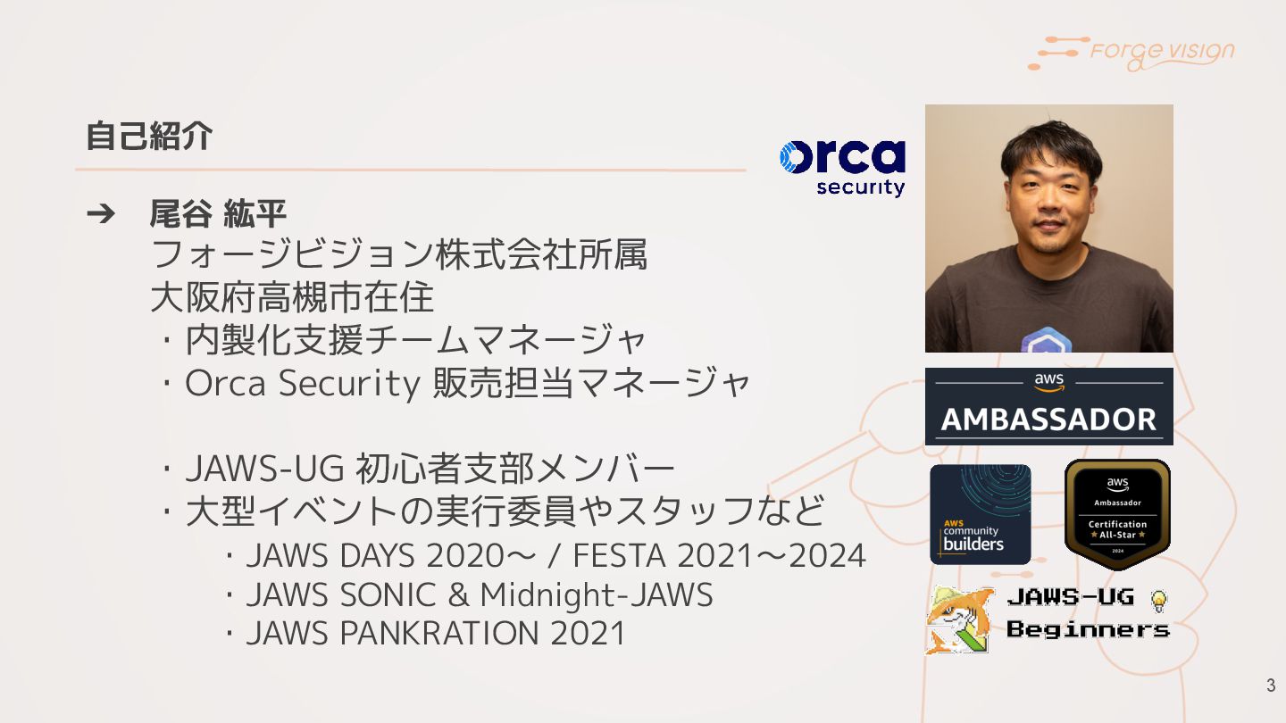 自己紹介 ➔ 尾谷 紘平 フォージビジョン株式会社所属 大阪府高槻市在住 ・内製化支援チームマネージャ ・Orca Security 販売担当マネージャ