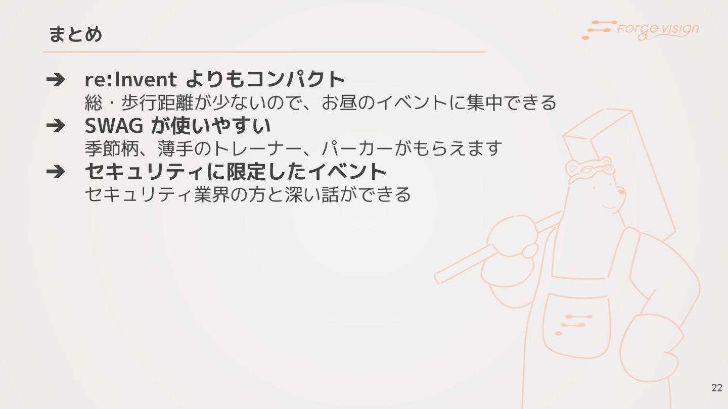 まとめ ➔ re:Invent よりもコンパクト 総・歩行距離が少ないので、お昼のイベントに集中できる ➔ SWAG が使いやすい 季節柄、薄手のトレーナー、パーカーがもらえます ➔
