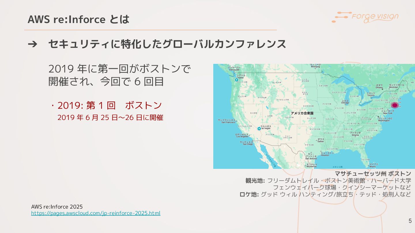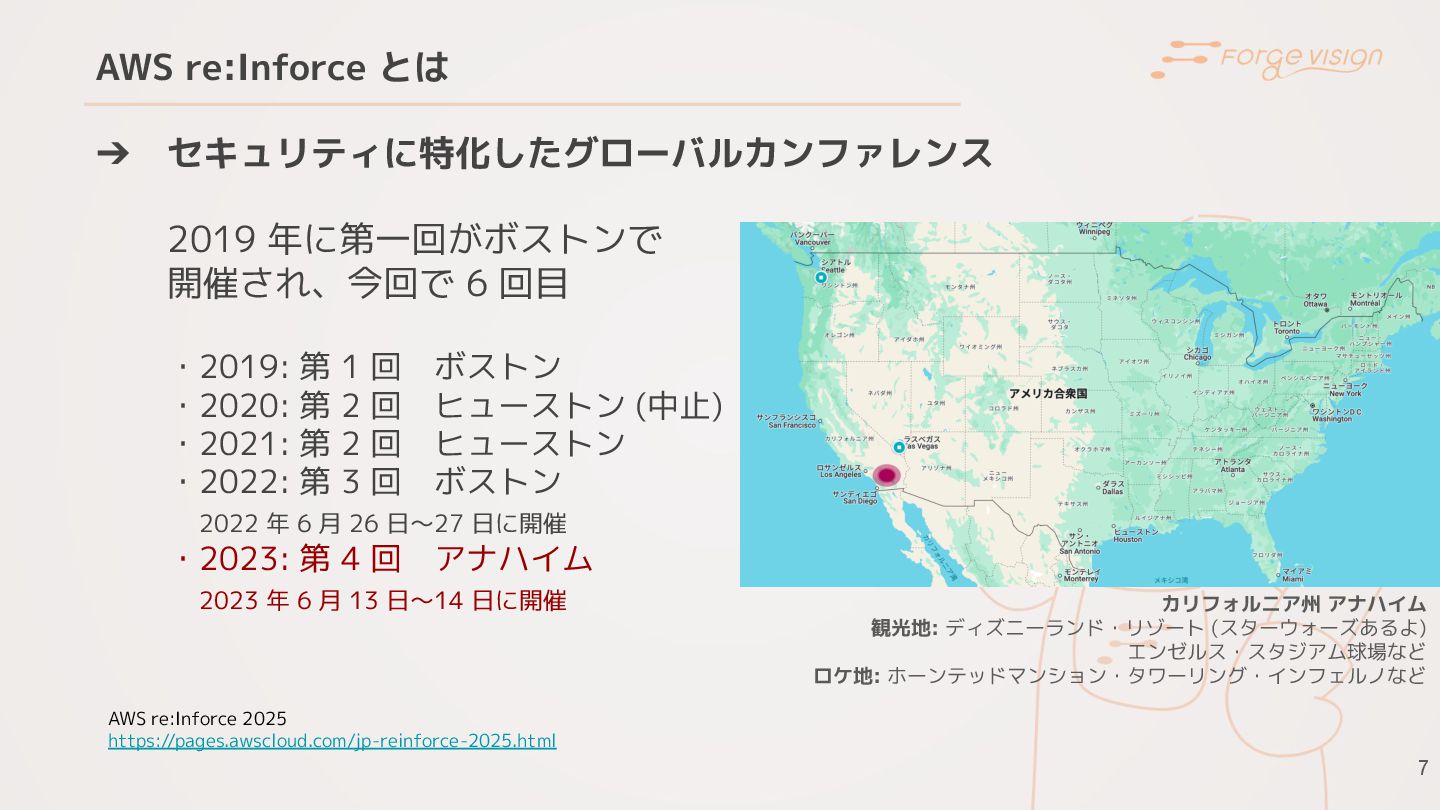 AWS re:Inforce 2025 https://pages.awscloud.com/jp-reinforce-2025.html AWS re:Inforce とは ➔ セキュリティに特化したグローバルカンファレンス 2019