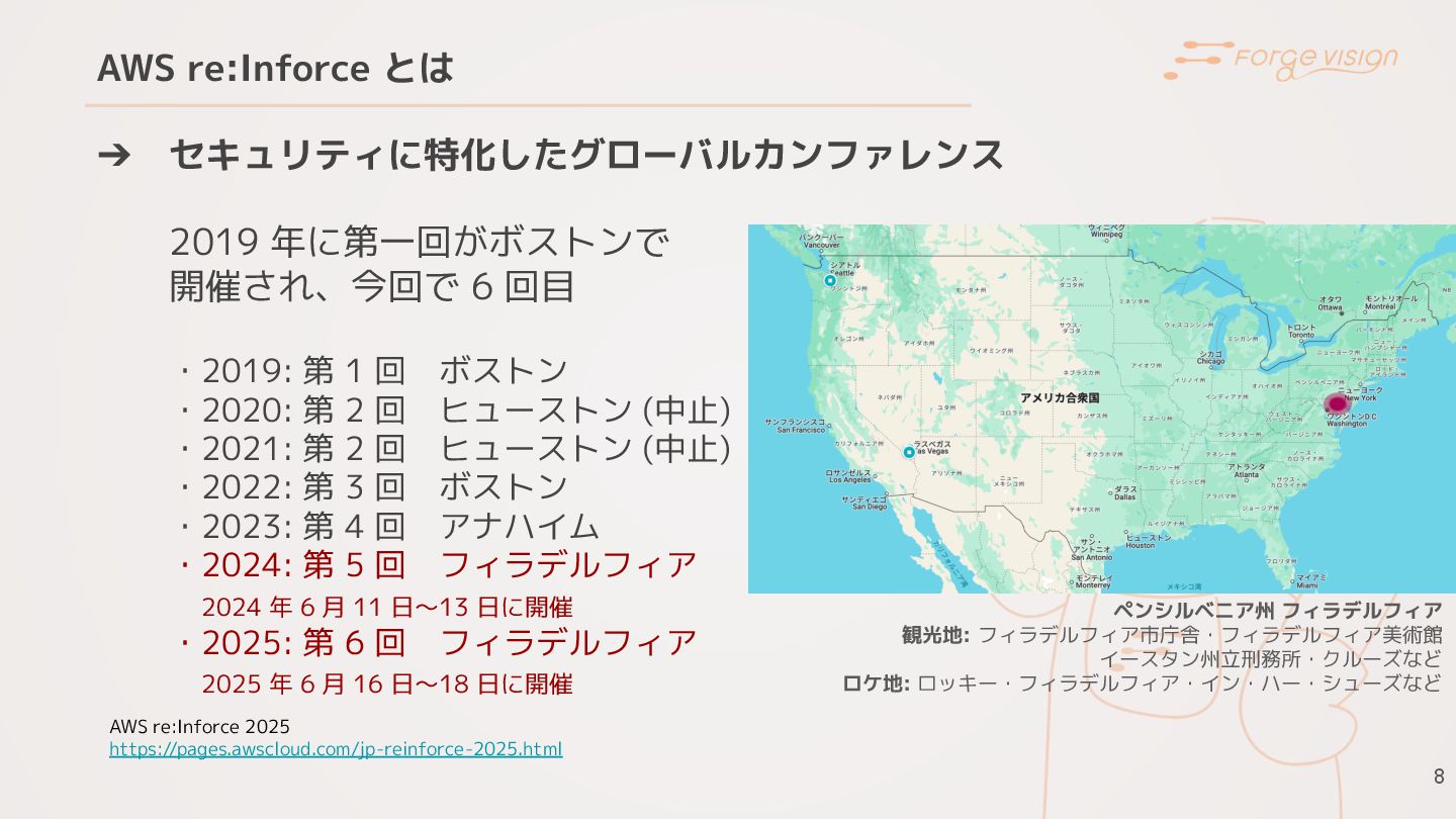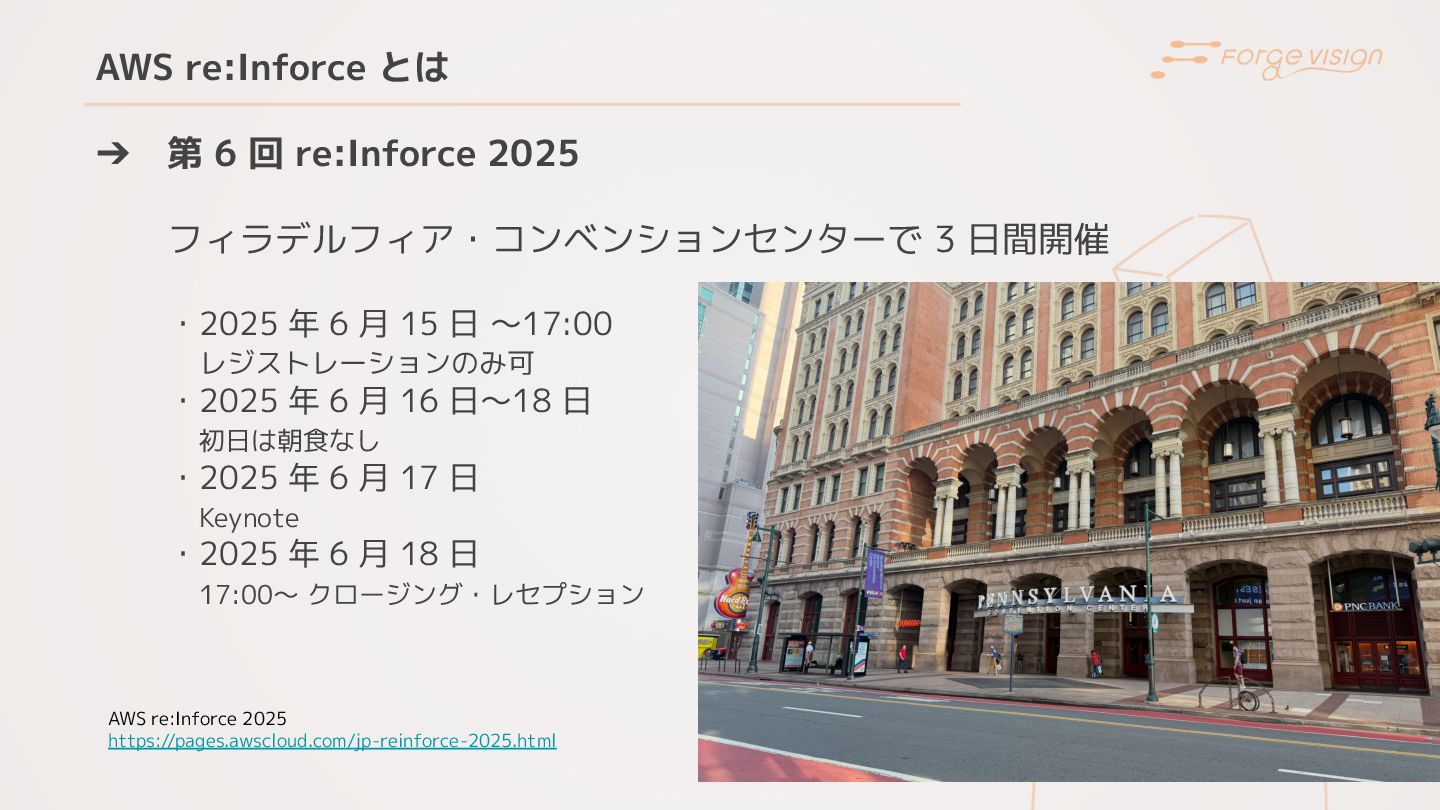 回 re:Inforce 2025 フィラデルフィア・コンベンションセンターで 3 日間開催 ・2025 年 6 月 15 日 〜17:00 レジストレーションのみ可 ・2025 年 6 月 16 日~18 日 初日は朝食なし ・2025 年 6 月 17 日 Keynote ・2025 年 6 月 18 日 17:00〜 クロージング・レセプション 9
