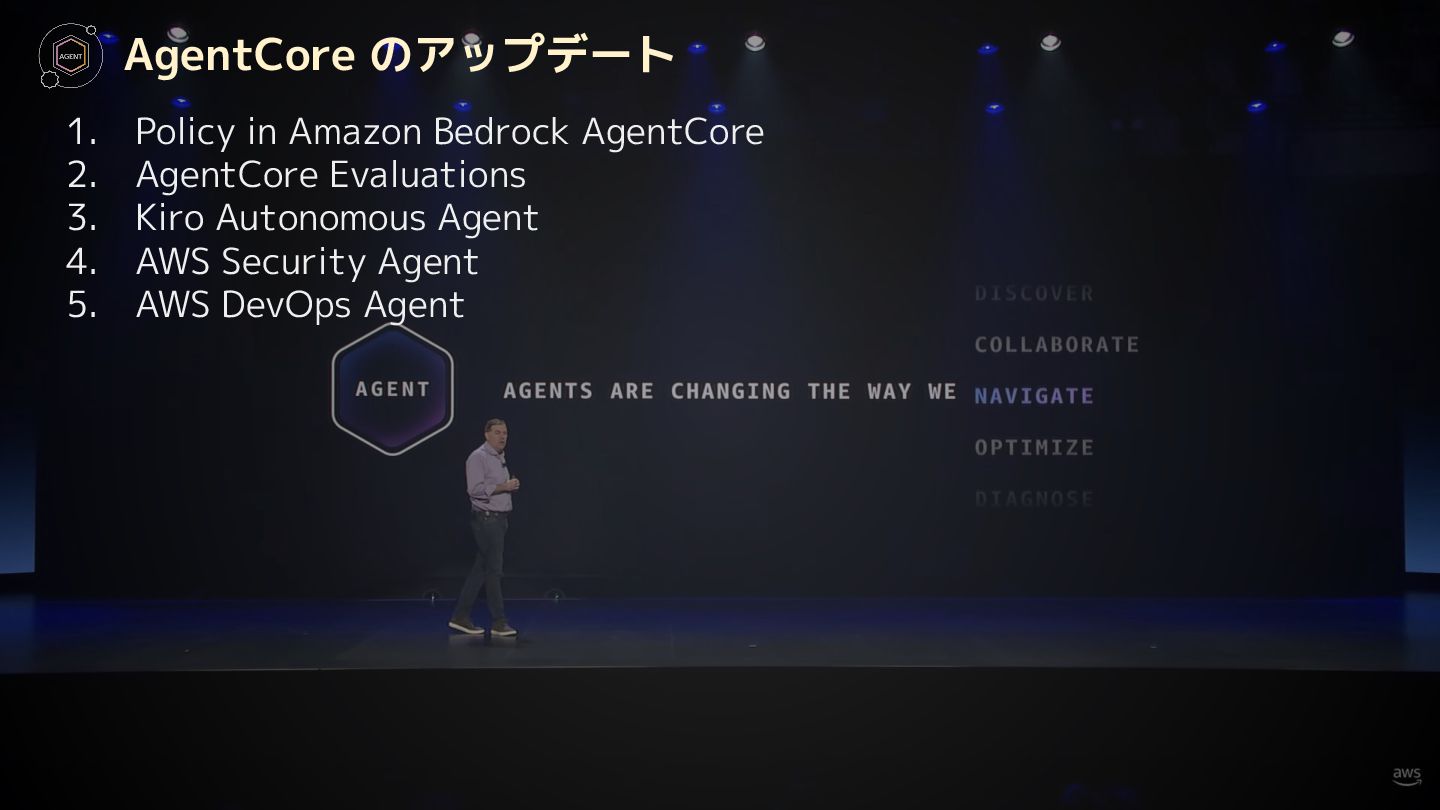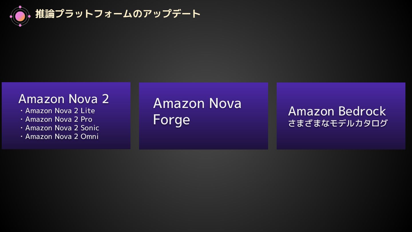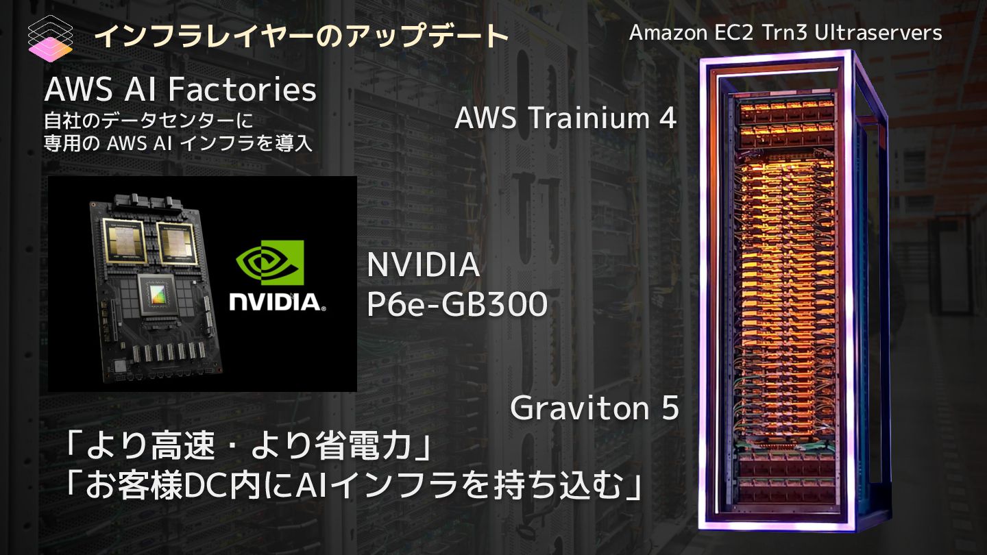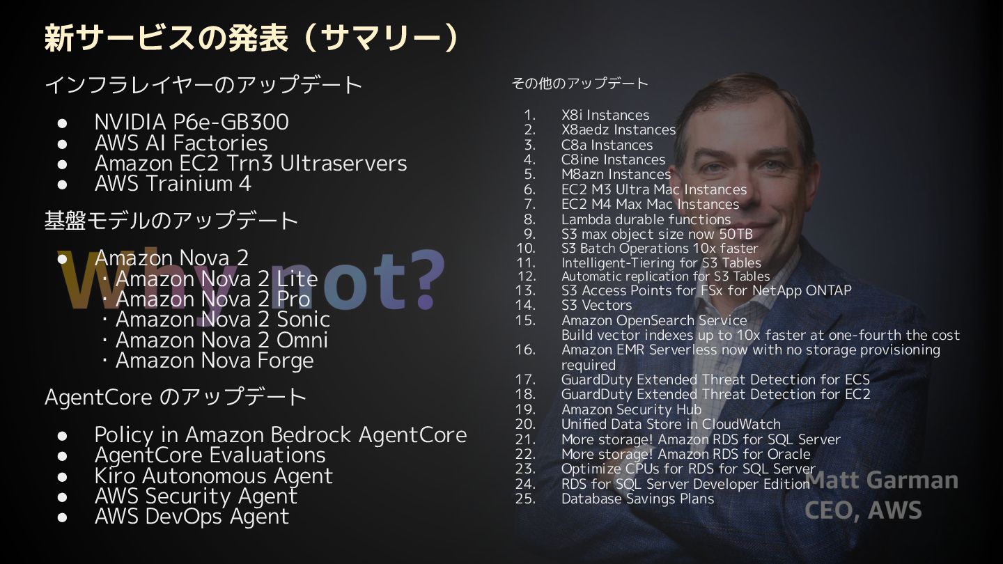 EC2 Trn3 Ultraservers • AWS Trainium 4 基盤モデルのアップデート • Amazon Nova 2 ・Amazon Nova 2 Lite ・Amazon Nova 2 Pro ・Amazon Nova 2 Sonic ・Amazon Nova 2 Omni ・Amazon Nova Forge AgentCore のアップデート • Policy in Amazon Bedrock AgentCore • AgentCore Evaluations • Kiro Autonomous Agent • AWS Security Agent • AWS DevOps Agent その他のアップデート 1. X8i Instances 2. X8aedz Instances 3. C8a Instances 4. C8ine Instances 5. M8azn Instances 6. EC2 M3 Ultra Mac Instances 7. EC2 M4 Max Mac Instances 8. Lambda durable functions 9. S3 max object size now 50TB 10. S3 Batch Operations 10x faster 11. Intelligent-Tiering for S3 Tables 12. Automatic replication for S3 Tables 13. S3 Access Points for FSx for NetApp ONTAP 14. S3 Vectors 15. Amazon OpenSearch Service Build vector indexes up to 10x faster at one-fourth the cost 16. Amazon EMR Serverless now with no storage provisioning required 17. GuardDuty Extended Threat Detection for ECS 18. GuardDuty Extended Threat Detection for EC2 19. Amazon Security Hub 20. Unified Data Store in CloudWatch 21. More storage! Amazon RDS for SQL Server 22. More storage! Amazon RDS for Oracle 23. Optimize CPUs for RDS for SQL Server 24. RDS for SQL Server Developer Edition 25. Database Savings Plans 新サービスの発表(サマリー)