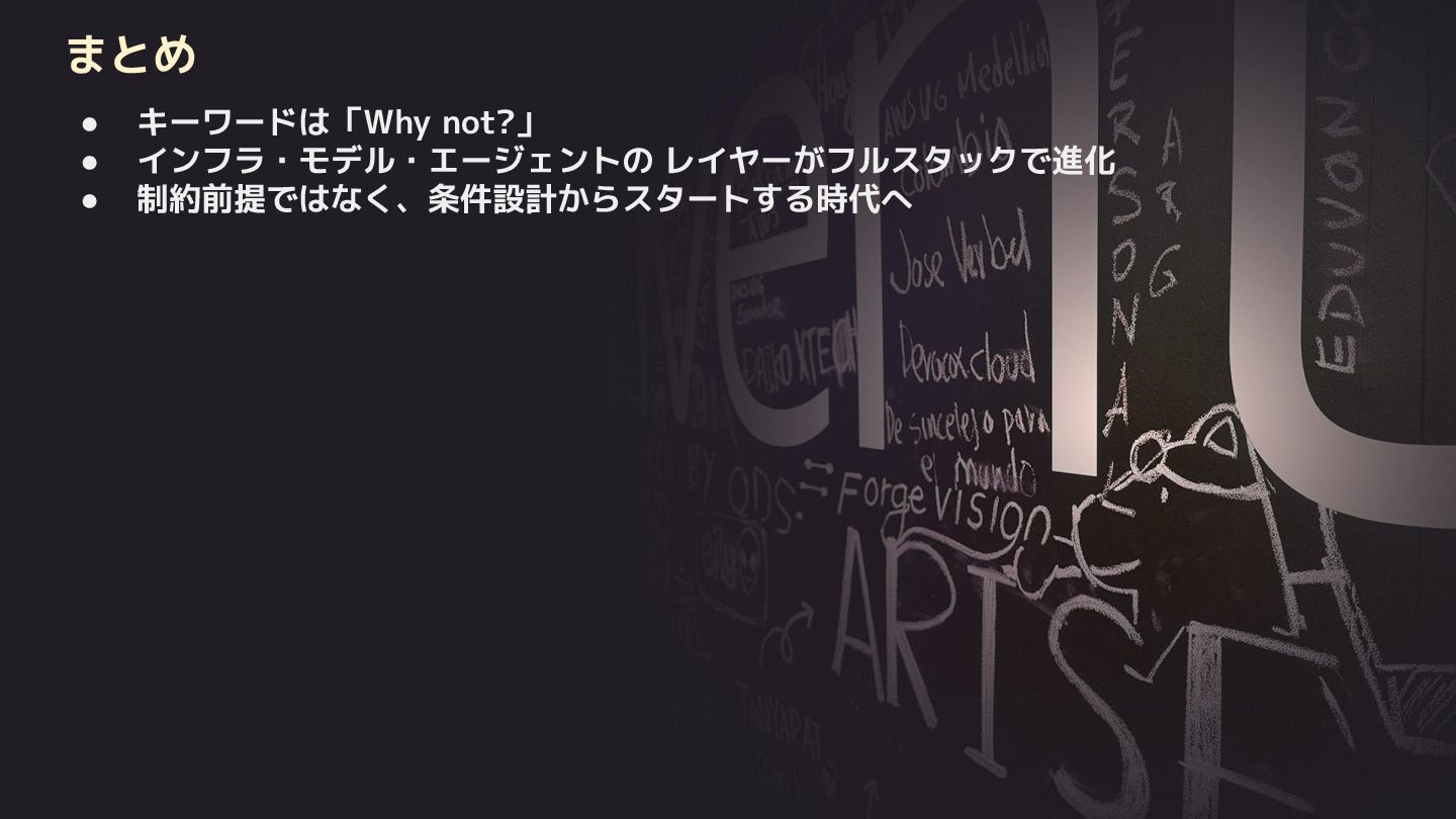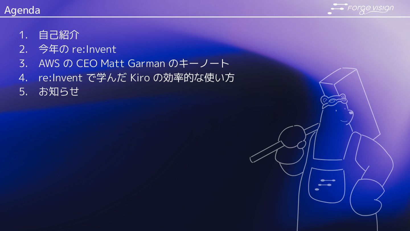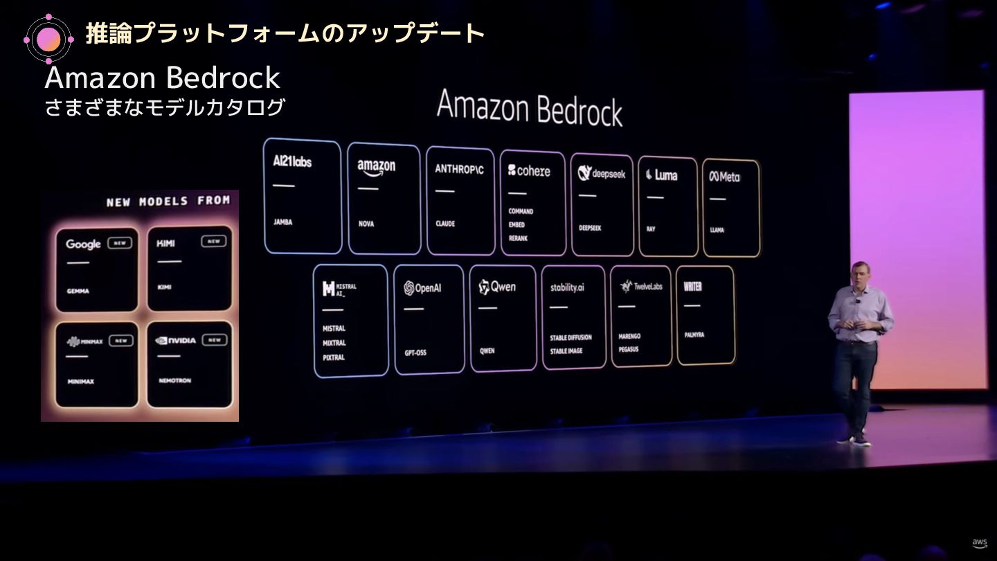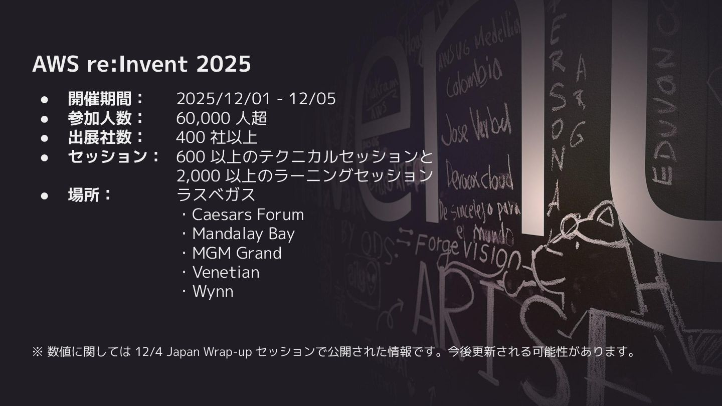 EC2 Trn3 Ultraservers • AWS Trainium 4 基盤モデルのアップデート • Amazon Nova 2 ・Amazon Nova 2 Lite ・Amazon Nova 2 Pro ・Amazon Nova 2 Sonic ・Amazon Nova 2 Omni ・Amazon Nova Forge AgentCore のアップデート • Policy in Amazon Bedrock AgentCore • AgentCore Evaluations • Kiro Autonomous Agent • AWS Security Agent • AWS DevOps Agent その他のアップデート 1. X8i Instances 2. X8aedz Instances 3. C8a Instances 4. C8ine Instances 5. M8azn Instances 6. EC2 M3 Ultra Mac Instances 7. EC2 M4 Max Mac Instances 8. Lambda durable functions 9. S3 max object size now 50TB 10. S3 Batch Operations 10x faster 11. Intelligent-Tiering for S3 Tables 12. Automatic replication for S3 Tables 13. S3 Access Points for FSx for NetApp ONTAP 14. S3 Vectors 15. Amazon OpenSearch Service Build vector indexes up to 10x faster at one-fourth the cost 16. Amazon EMR Serverless now with no storage provisioning required 17. GuardDuty Extended Threat Detection for ECS 18. GuardDuty Extended Threat Detection for EC2 19. Amazon Security Hub 20. Unified Data Store in CloudWatch 21. More storage! Amazon RDS for SQL Server 22. More storage! Amazon RDS for Oracle 23. Optimize CPUs for RDS for SQL Server 24. RDS for SQL Server Developer Edition 25. Database Savings Plans 新サービスの発表(サマリー)