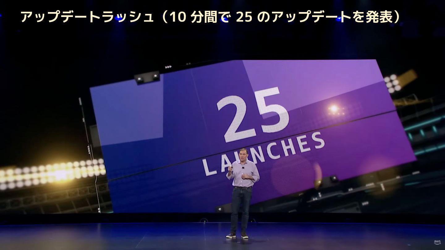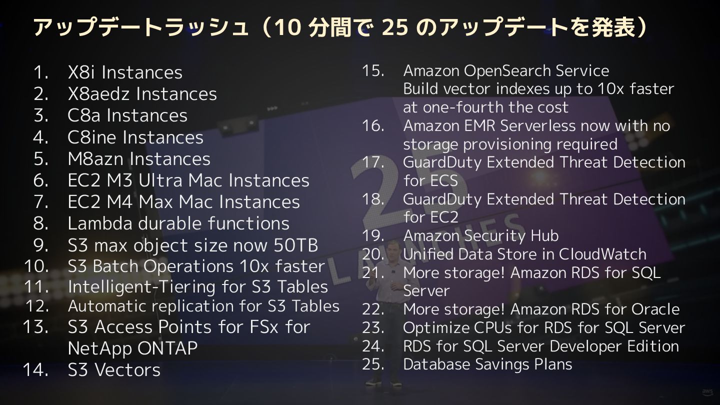 C8ine Instances 5. M8azn Instances 6. EC2 M3 Ultra Mac Instances 7. EC2 M4 Max Mac Instances 8. Lambda durable functions 9. S3 max object size now 50TB 10. S3 Batch Operations 10x faster 11. Intelligent-Tiering for S3 Tables 12. Automatic replication for S3 Tables 13. S3 Access Points for FSx for NetApp ONTAP 14. S3 Vectors 15. Amazon OpenSearch Service Build vector indexes up to 10x faster at one-fourth the cost 16. Amazon EMR Serverless now with no storage provisioning required 17. GuardDuty Extended Threat Detection for ECS 18. GuardDuty Extended Threat Detection for EC2 19. Amazon Security Hub 20. Unified Data Store in CloudWatch 21. More storage! Amazon RDS for SQL Server 22. More storage! Amazon RDS for Oracle 23. Optimize CPUs for RDS for SQL Server 24. RDS for SQL Server Developer Edition 25. Database Savings Plans アップデートラッシュ(10 分間で 25 のアップデートを発表)