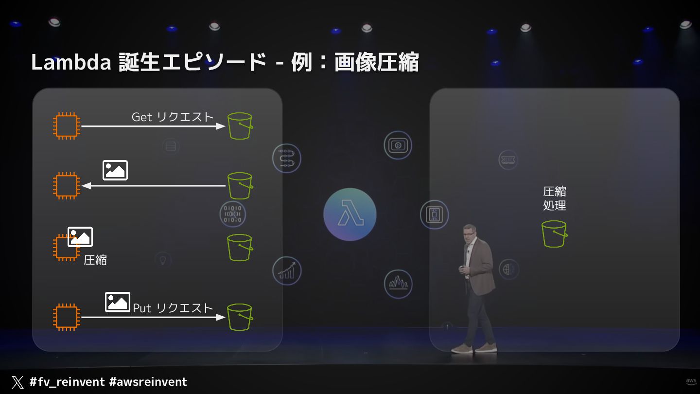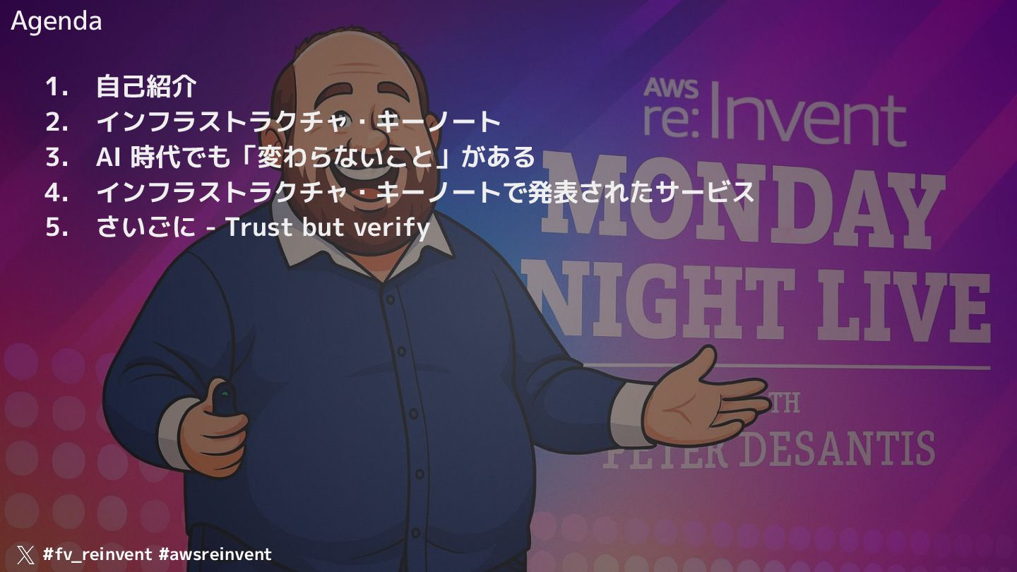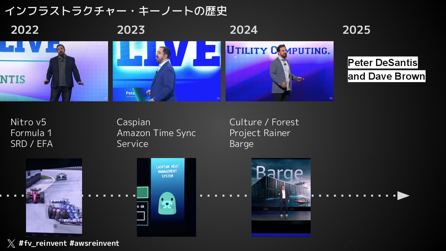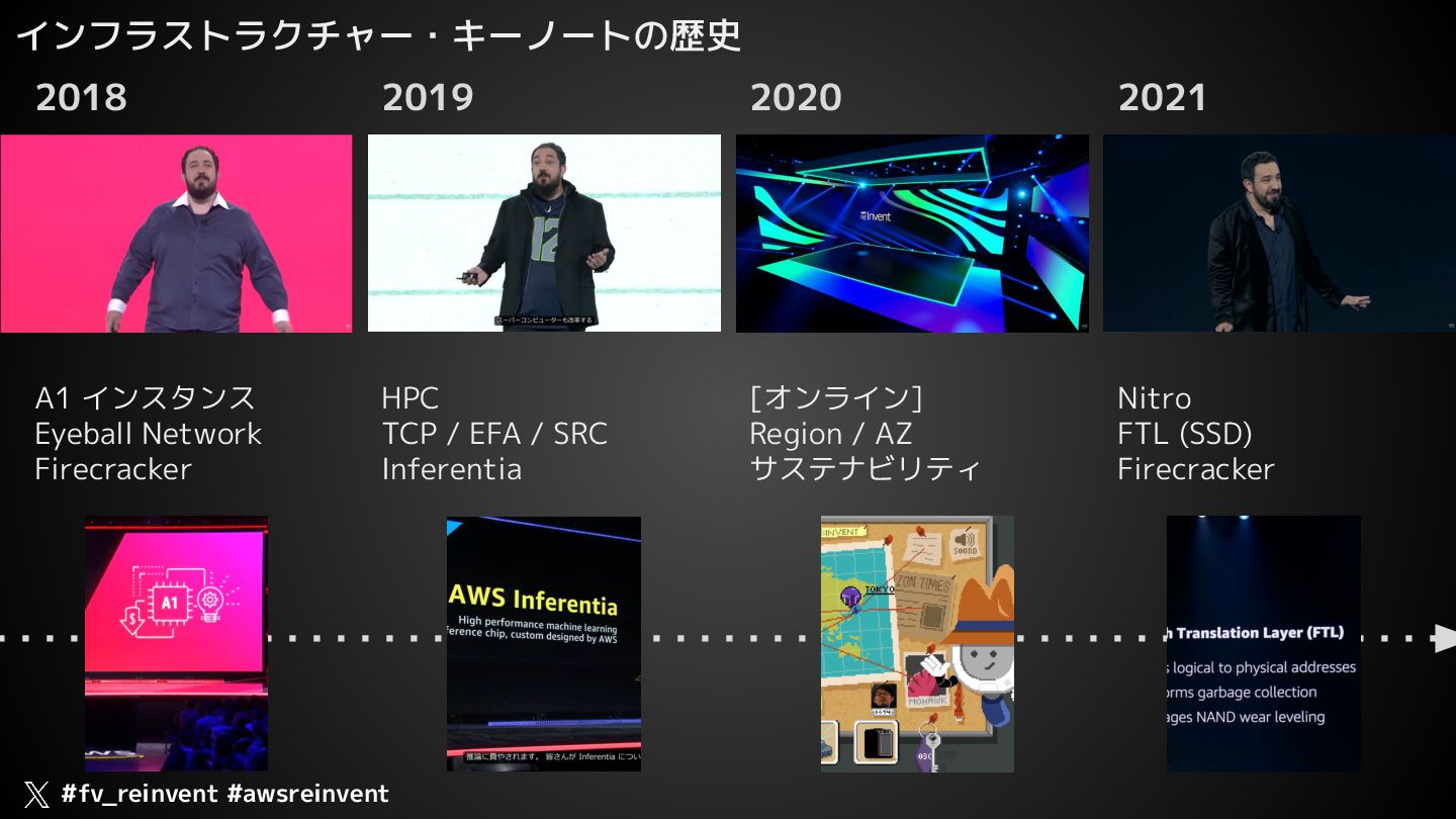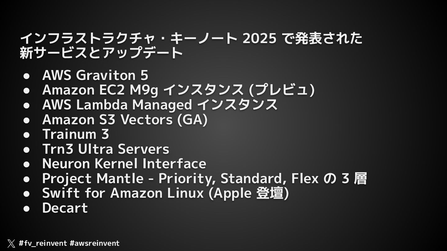 2: M6g, R6g, C6g (2019) • Graviton 3: C7g (2021) • Graviton 3e: HPC7g (2022) • Graviton 4: R8g (2023) • Graviton 5: M9g インスタンス (2025) • AWS の Arm CPU。高速で、電力効率が高い • コア数が倍 (192 コア) に、L3 キャッシュが 5.3 倍に • 性能あたりの電力効率も向上 • Airbnb / ATLASSIAN / honeycomb.io / SAP で先行利用開始 #fv_reinvent #awsreinvent