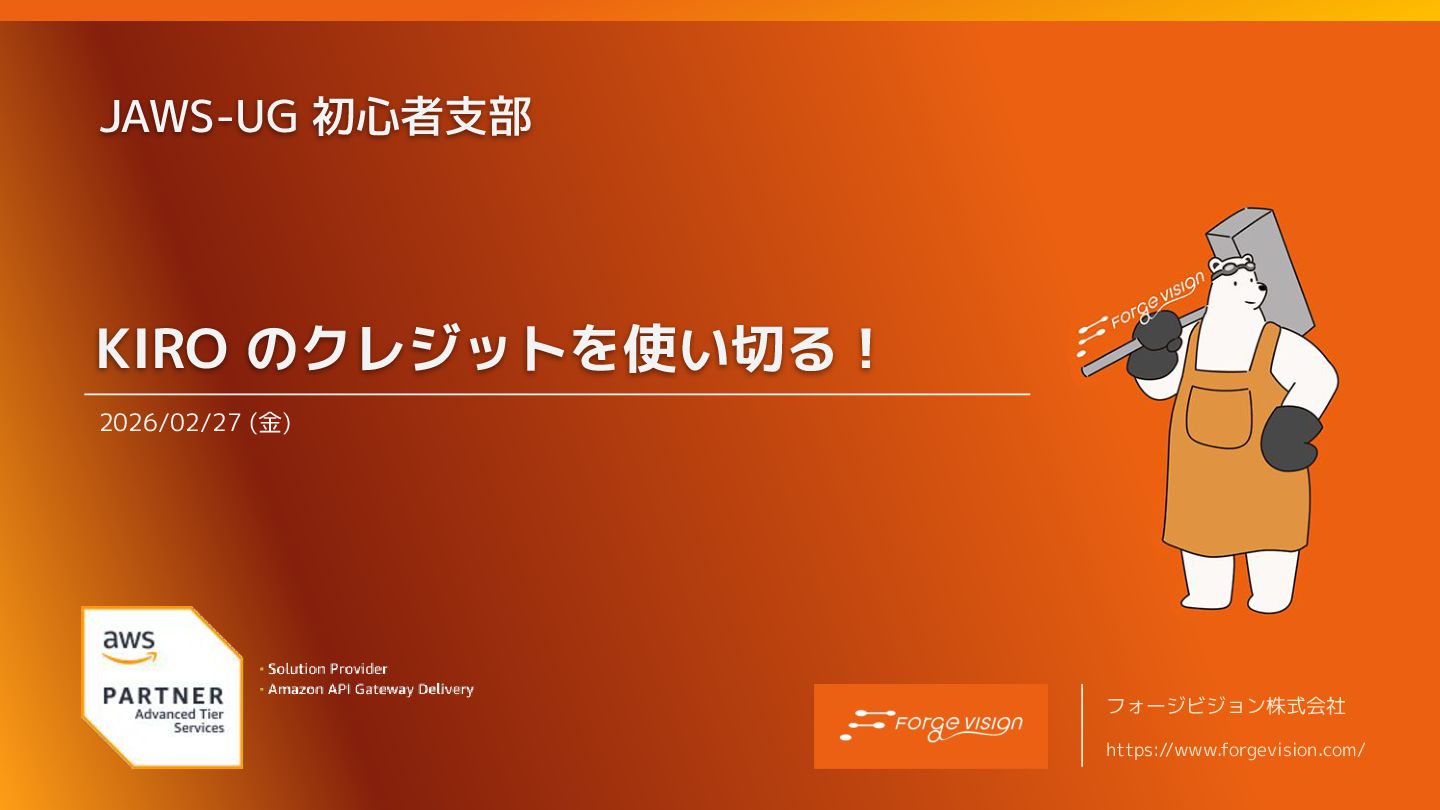 JAWS-UG 初心者支部 KIRO のクレジットを使い切る! 2026/02/27 (金) フォージビジョン株式会社 https://www.forgevision.com/
