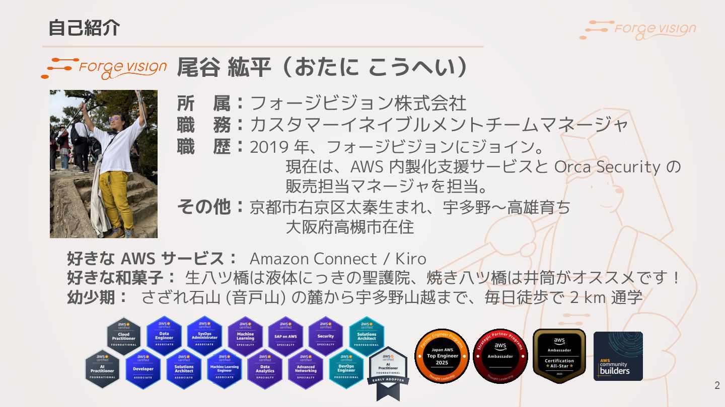 自己紹介 2 尾谷 紘平(おたに こうへい) 所 属:フォージビジョン株式会社 職 務:カスタマーイネイブルメントチームマネージャ 職 歴:2019 年、フォージビジョンにジョイン。 現在は、AWS