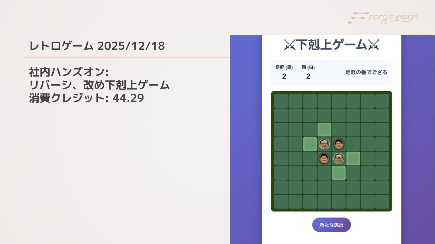 レトロゲーム 2025/12/18 社内ハンズオン: リバーシ、改め下剋上ゲーム 消費クレジット: 44.29 11