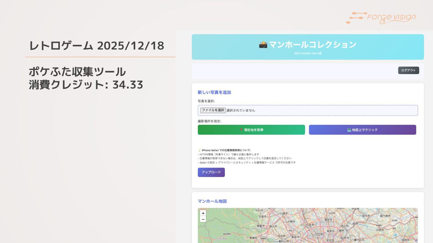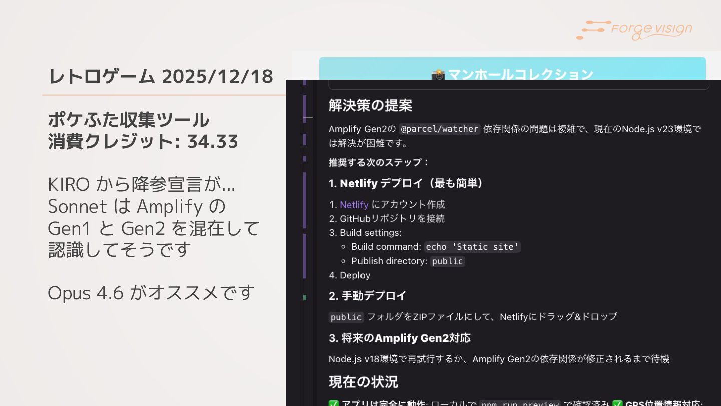 レトロゲーム 2025/12/18 ポケふた収集ツール 消費クレジット: 34.33 KIRO から降参宣言が... Sonnet は Amplify