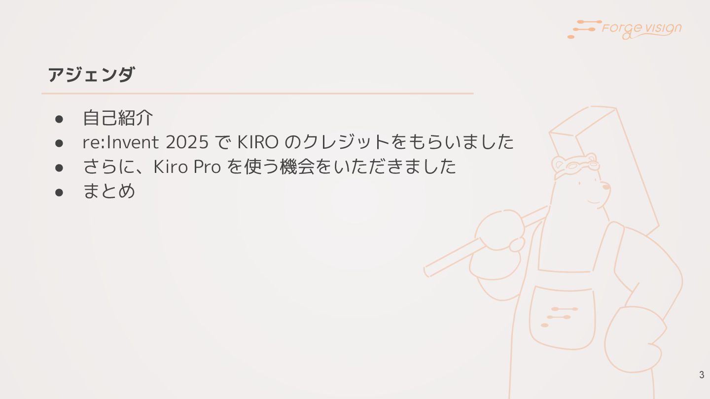 3 アジェンダ • 自己紹介 • re:Invent 2025 で KIRO のクレジットをもらいました
